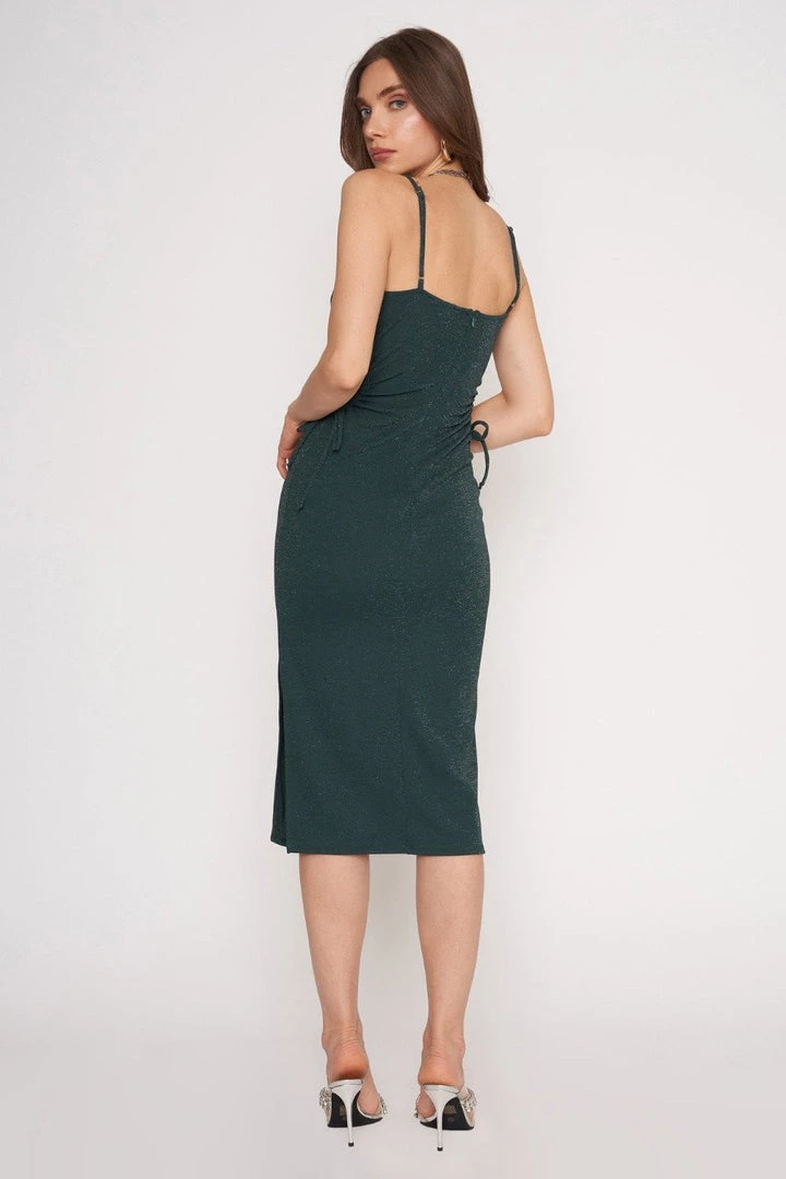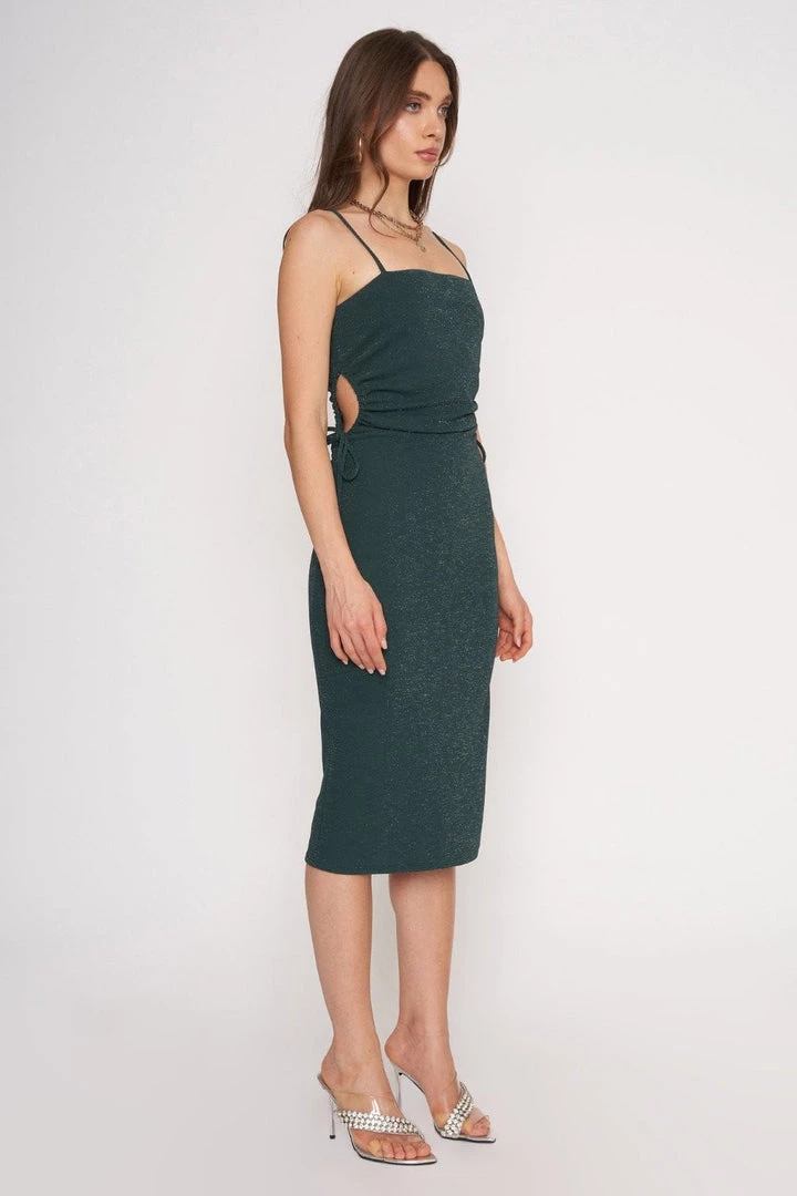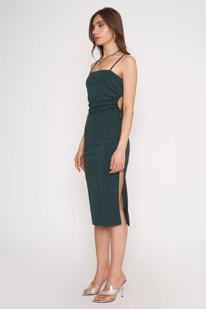 Square neck spaghetti strap midi dress with side slit and tie detail.