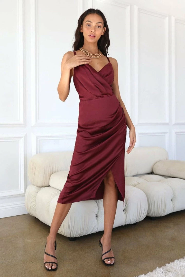 This surplice slip dress from Adelyn Rae features cross strap back, faux wrap pleated skirt, an asymmetrical hemline and a hidden back zipper. The fabric is a satin with slight stretch.