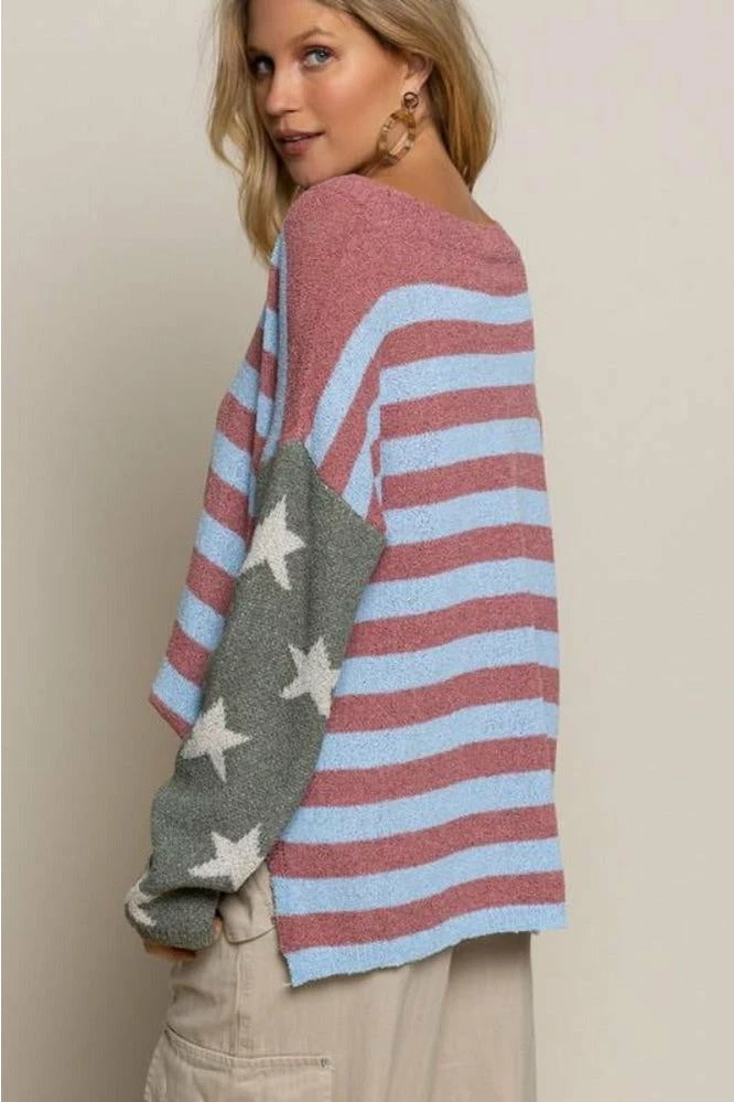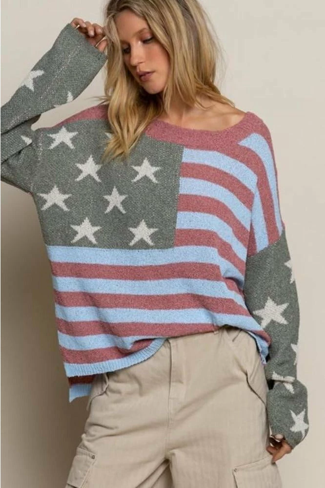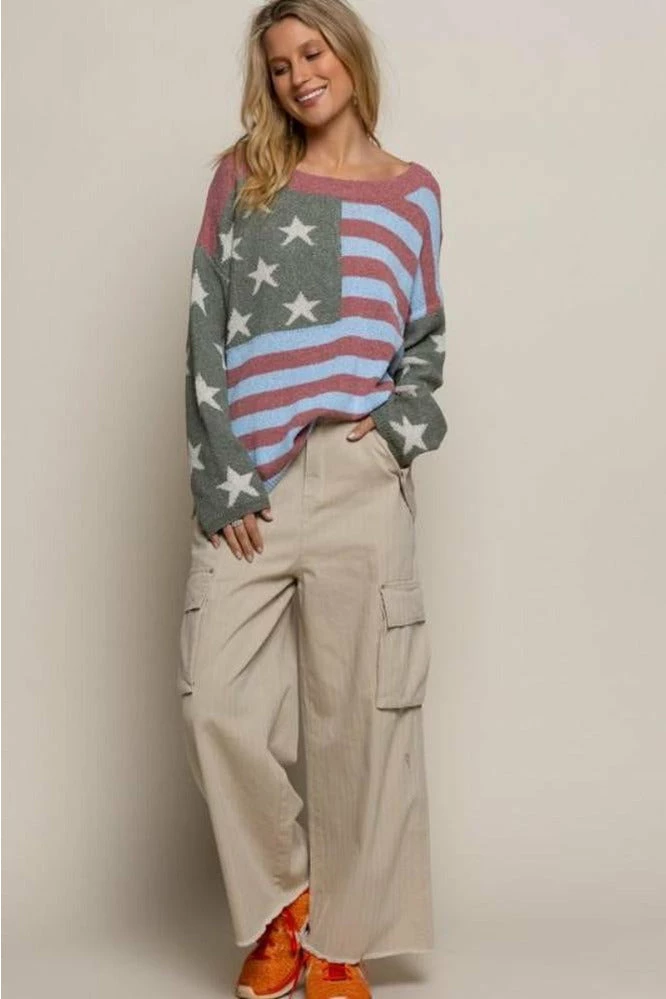 American flag long sleeve round boat neck high lo sweater top sweater.