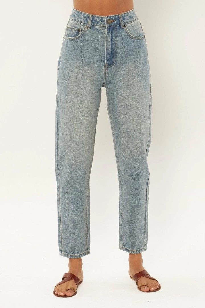 Mid-rise, 5 pocket denim with button fly and a tapered leg.