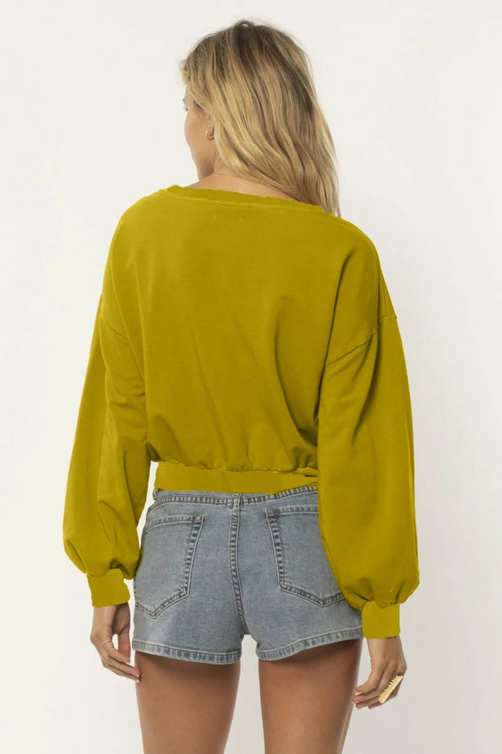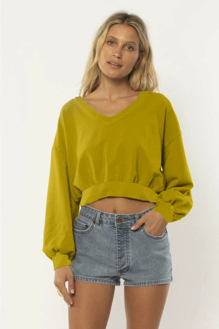 EVILYN IS IN OUR IRRESISTIBLEY SOFT GARMENT PIGMENT DYED FLEECE WITH RIB NECK WAIST AND CUFF FINISHES. SHE HAS AN OPEN V NECKLINE AND A CROPPED EASY FIT.