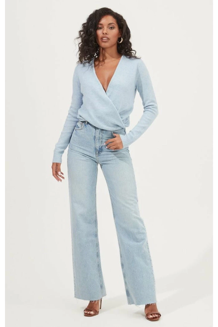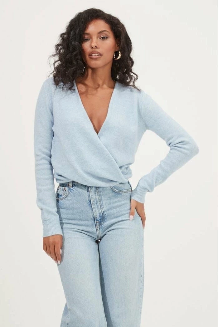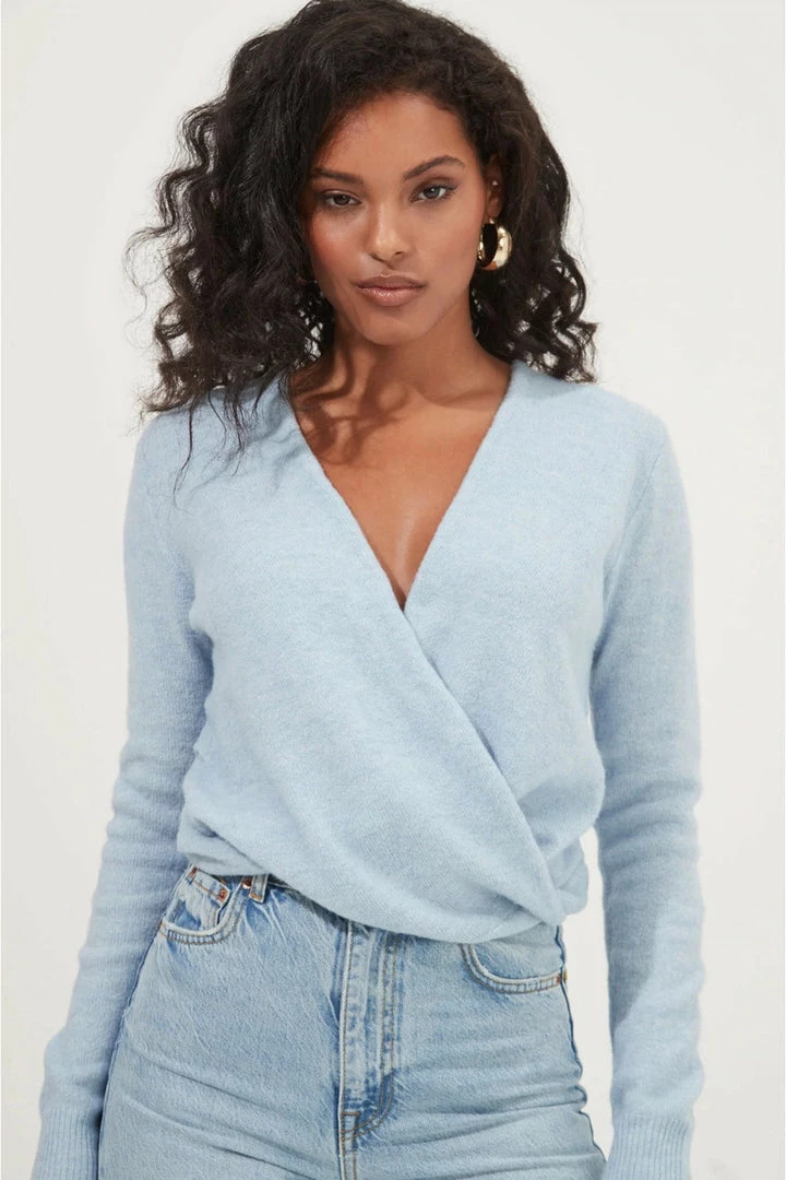 This cozy sweater features a flattering V neckline that descends to a wrapped front. Long sleeves. Relaxed fit. Pull On Style.