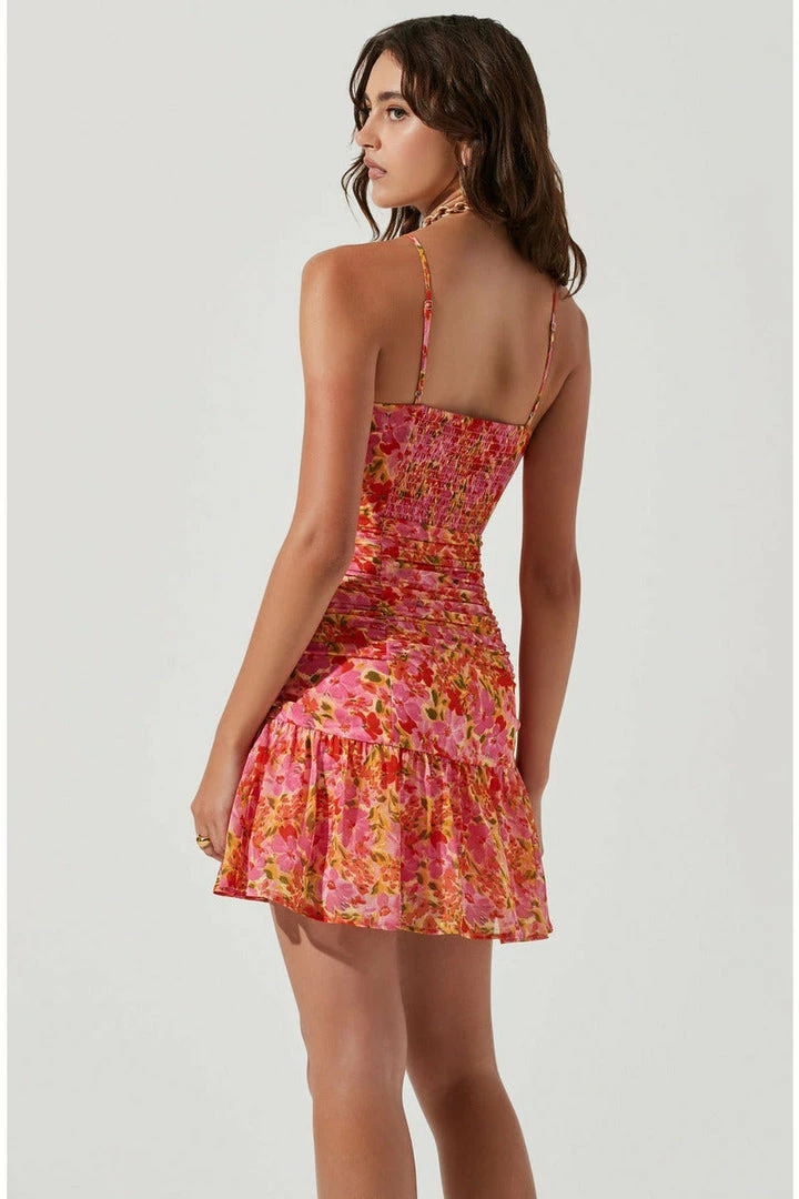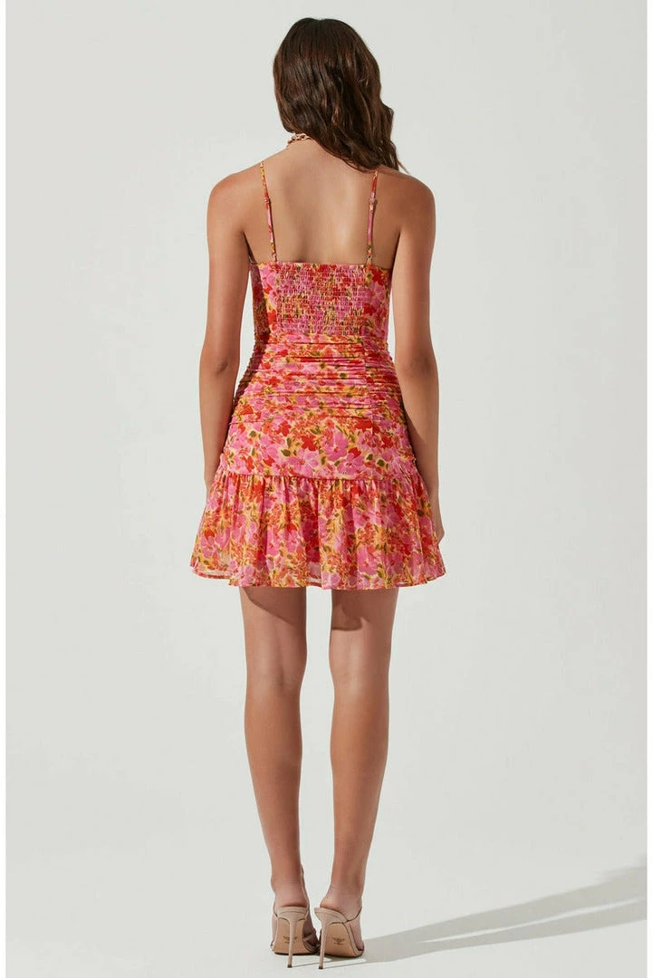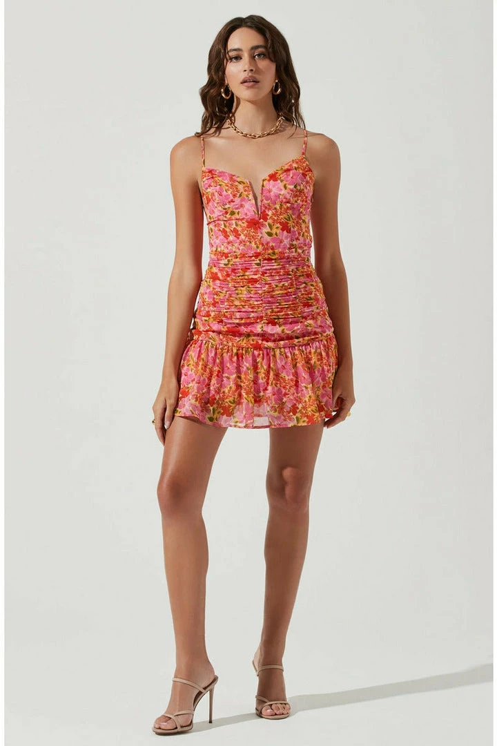 The Meg Dress features a ditzy floral print throughout. Sweetheart neckline leads to an underwired notch detail. Ruched bodice leads to a ruffle trim mini skirt. Fully lined. Concealed zip closure. Adjustable straps.