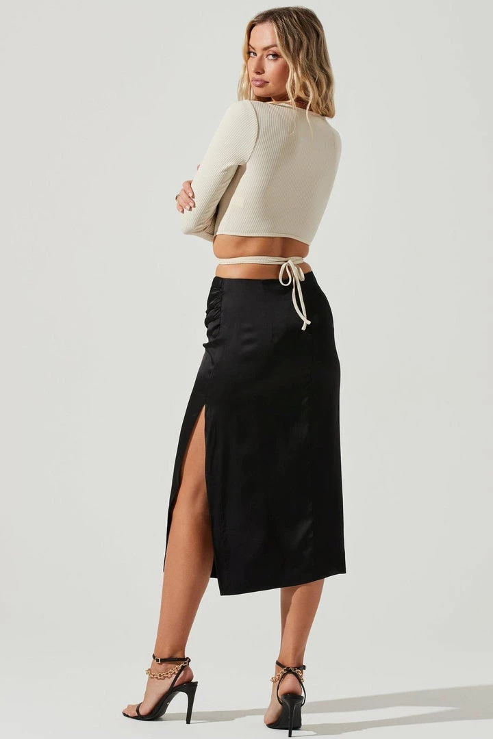 This sleek midi skirt features a high waist with ruched detailing at the hips. Long side slit accent. Hidden back zip closure. Pair it with the ASTR Perry Satin Wrap Front Tie Waist Top.