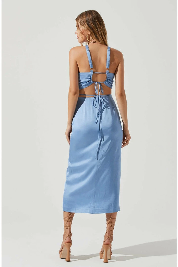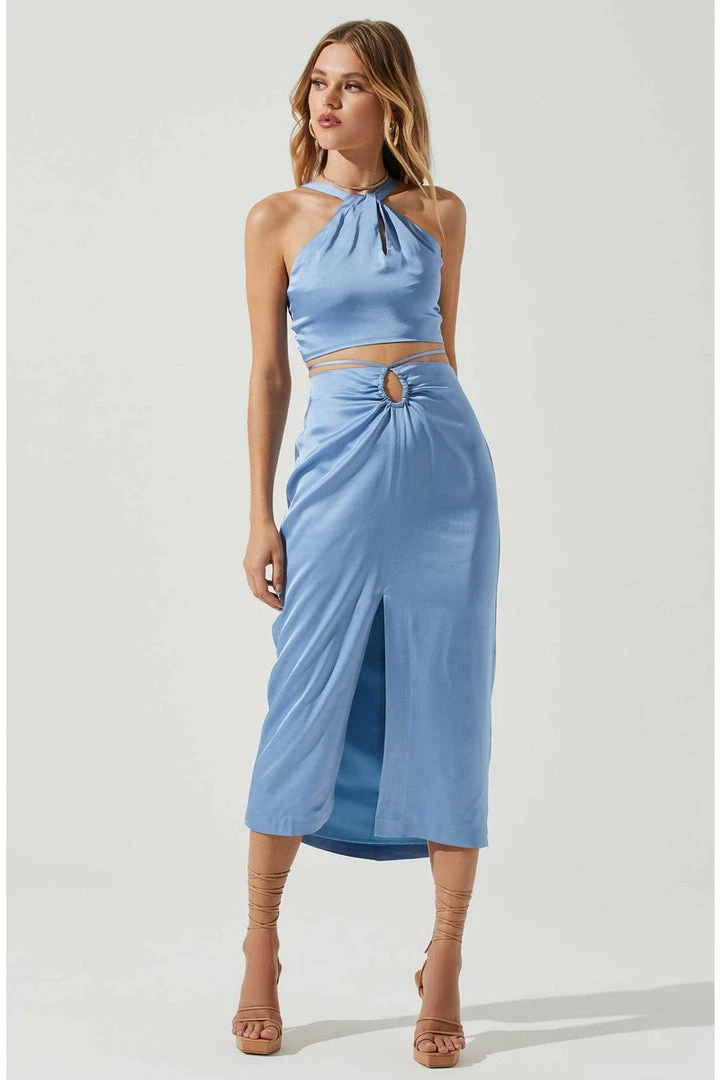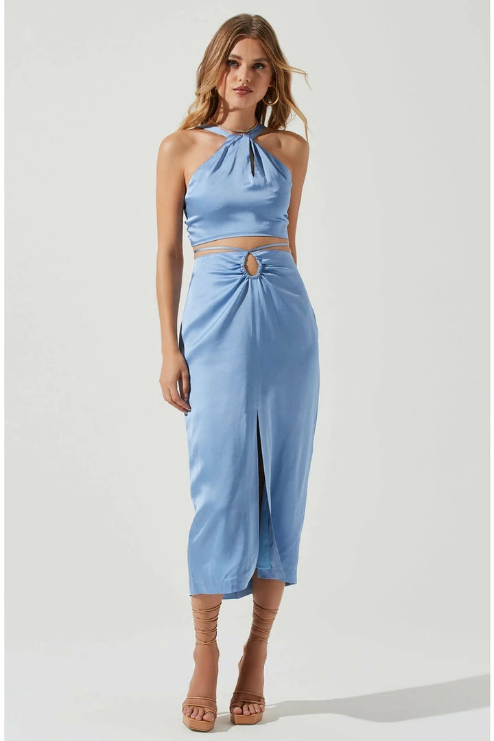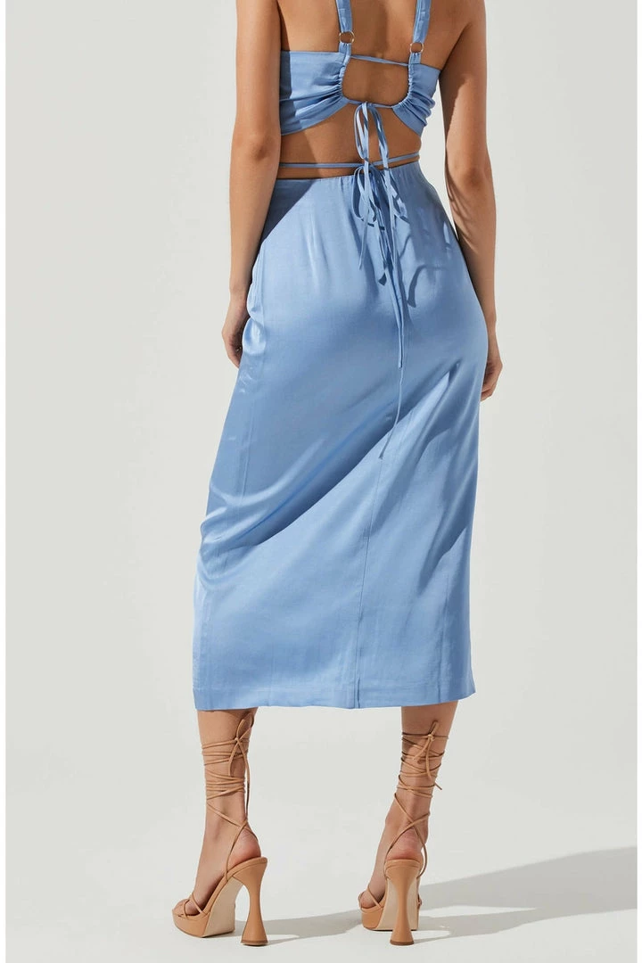 Luxuriously soft and chic! The Robin Skirt features a tie waist design with a cutout accent. Front slit accent. Midi length.