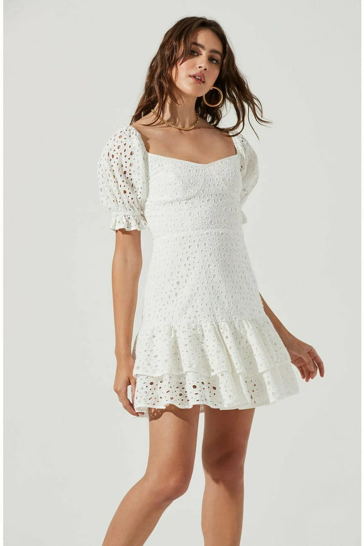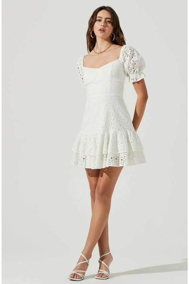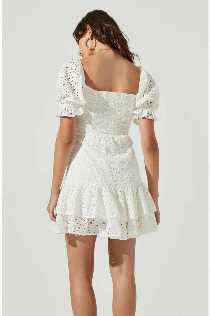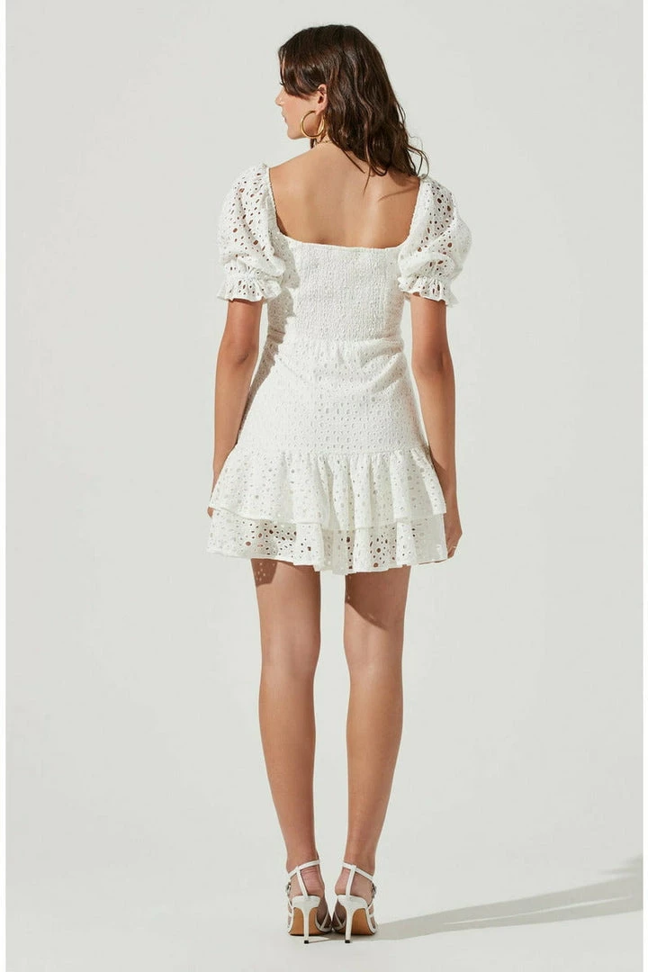 Ready for all the garden parties! The Roseville Dress features an elevated pointelle design that features a subtle sweetheart neckline and short puff sleeves with elasticized arm openings. Cupped bust leads to a defined waist and flare mini skirt with tiered ruffle trim. Smocked back. Fully lined. Concealed side zip closure.
