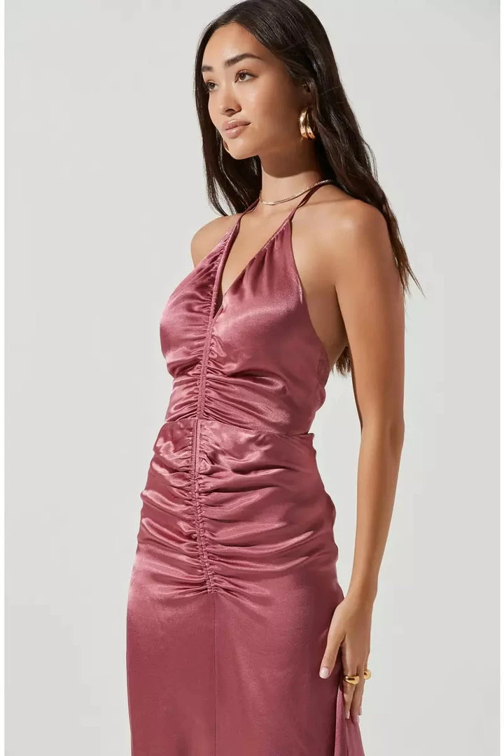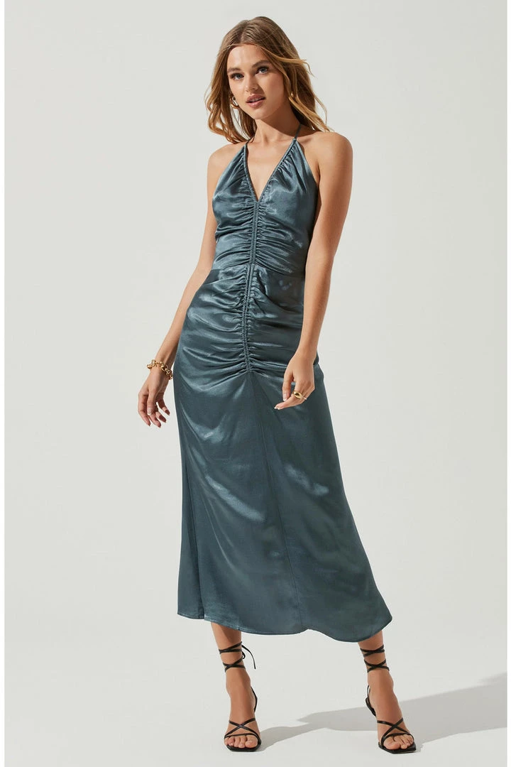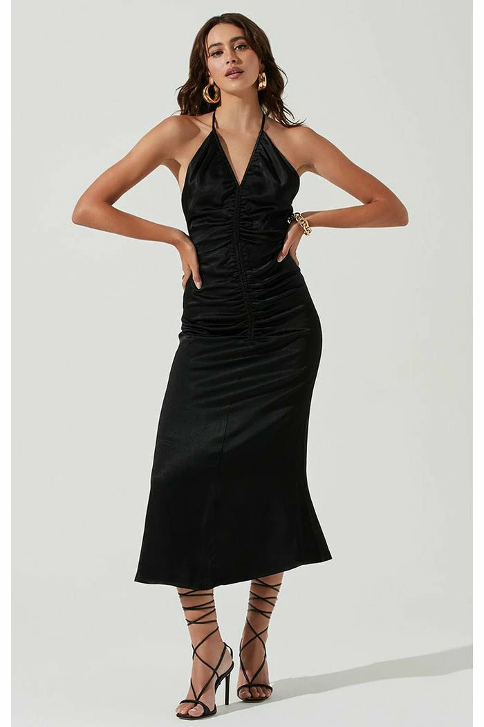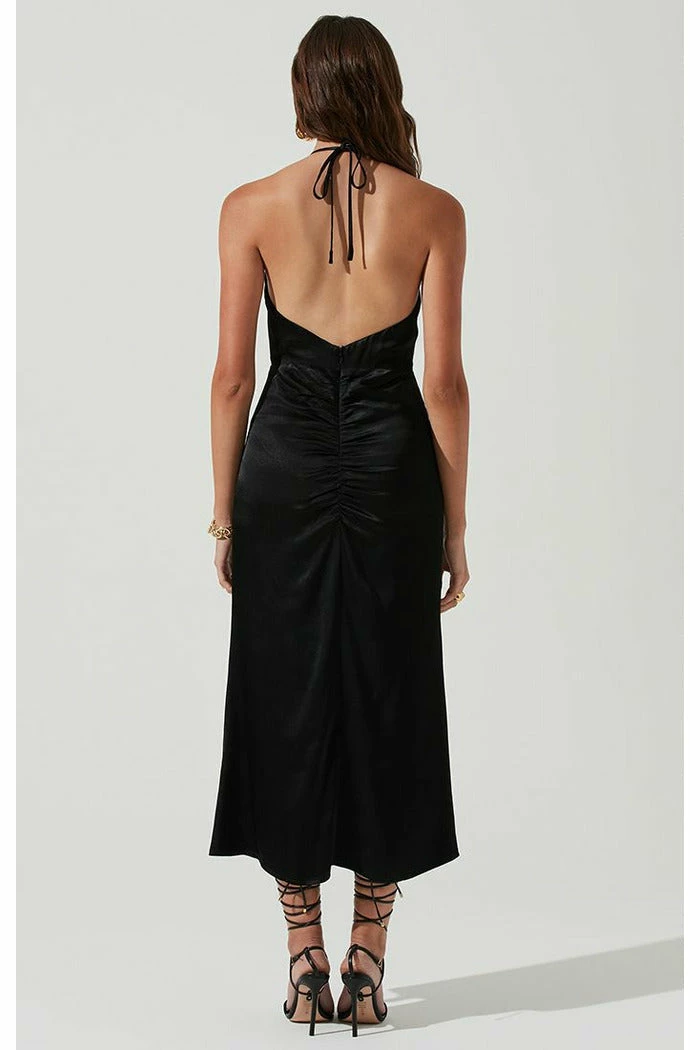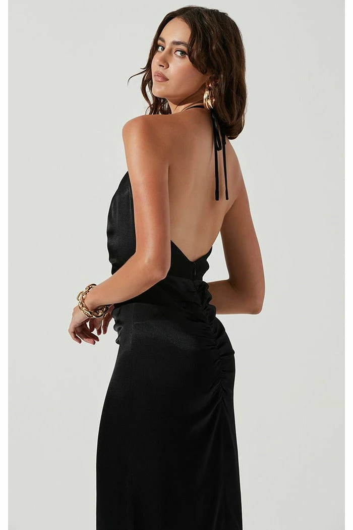 The Toledo Dress features a satin-effect finish that begins with a V neckline and triangle cup bust.