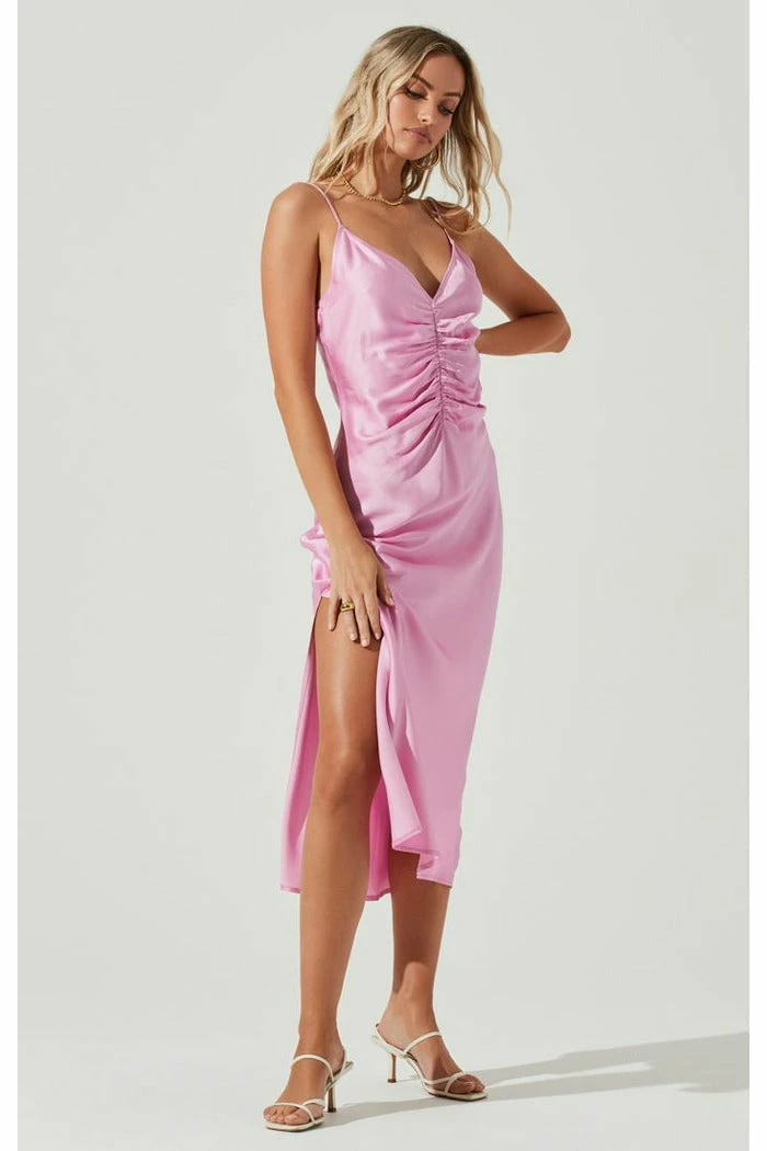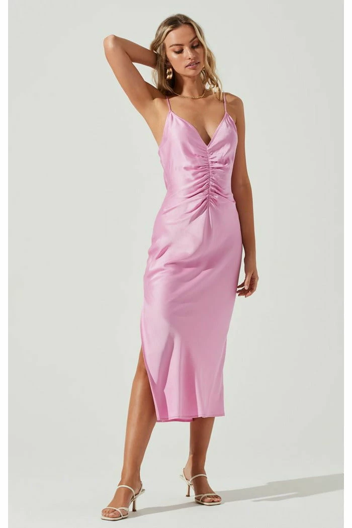 The Valinda Dress features a plunging V neckline that leads to a ruched front and side slit accent. Midi-length skirt. Adjustable straps.Pull On Style.