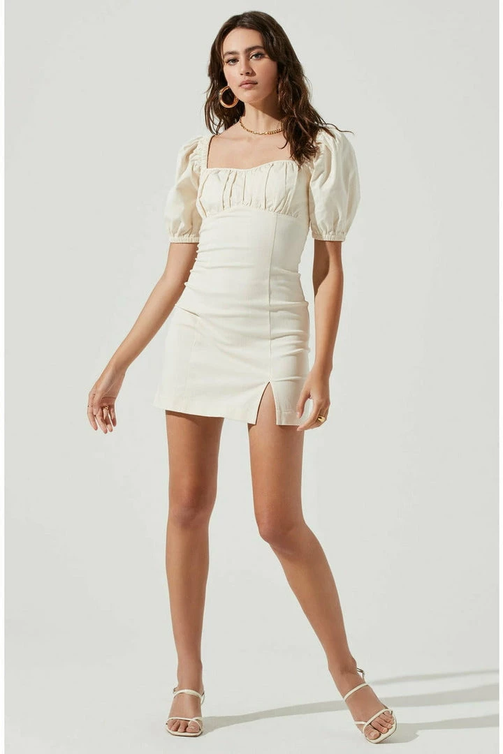 The Wendy Dress features a square neckline that leads to a ruched bust. Short puff sleeves. Subtle front slit accent. Smocked back.