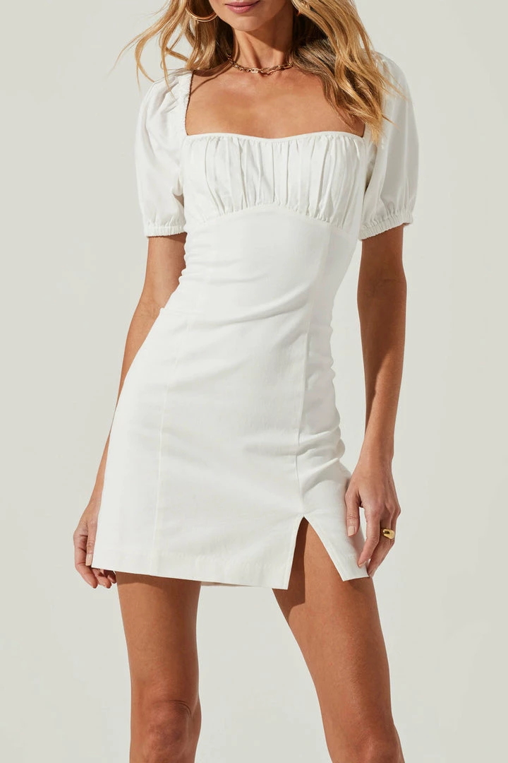 The Wendy Dress features a square neckline that leads to a ruched bust. Short puff sleeves. Subtle front slit accent. Smocked back. Invisible zipper.