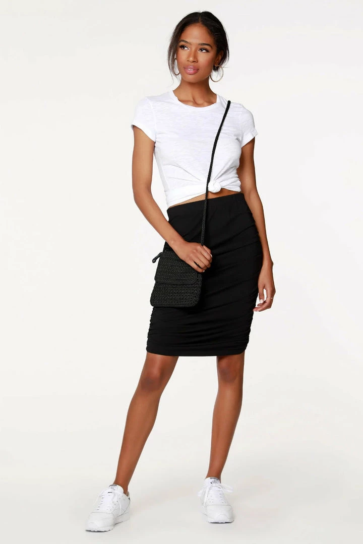 This skirt will be your go-to when you don’t want to sacrifice comfort for style. It is supple and stretchy with shirring along both side seams making it very flattering. Pair with our Shirred Crop Top for an elegant matching set or use it as the base for any of your favorite tops!