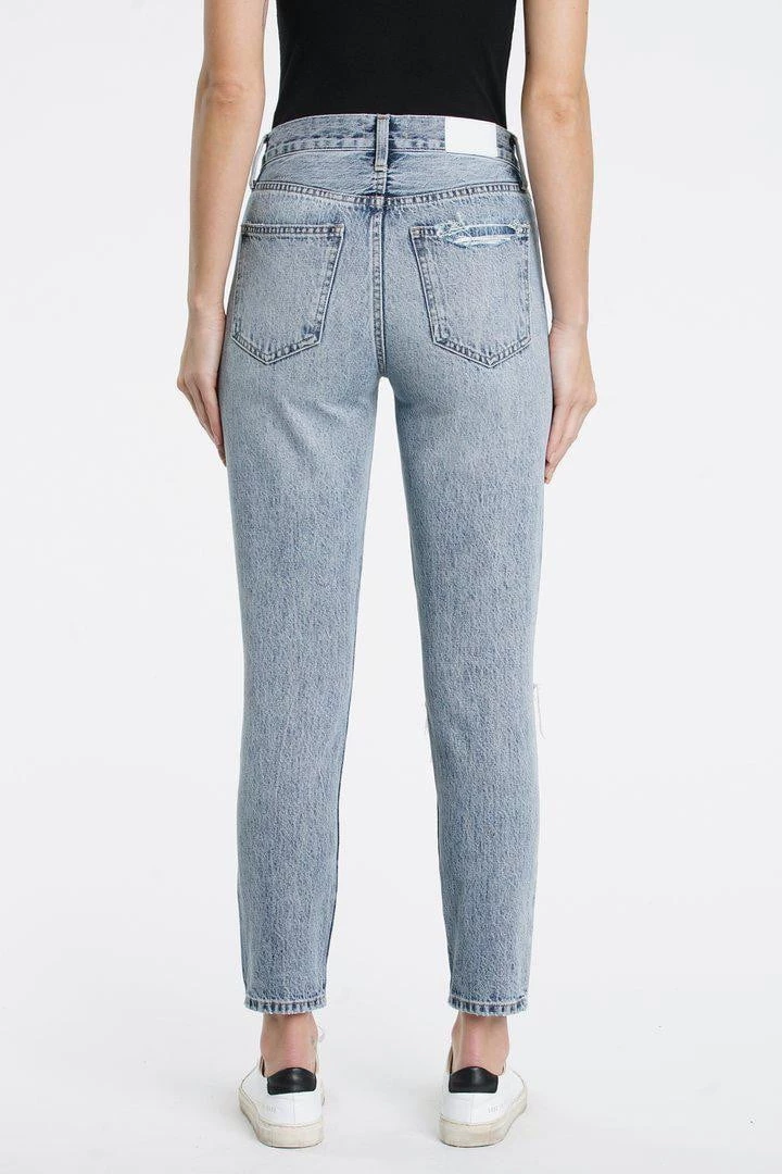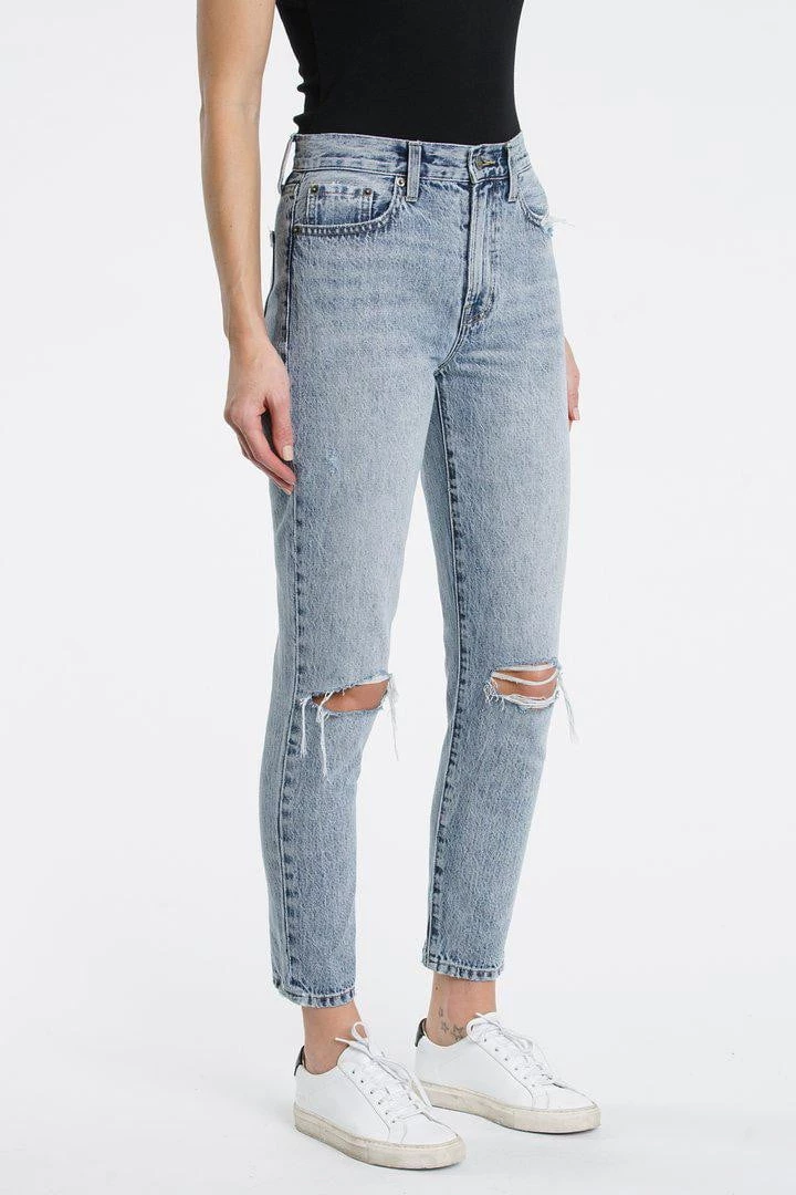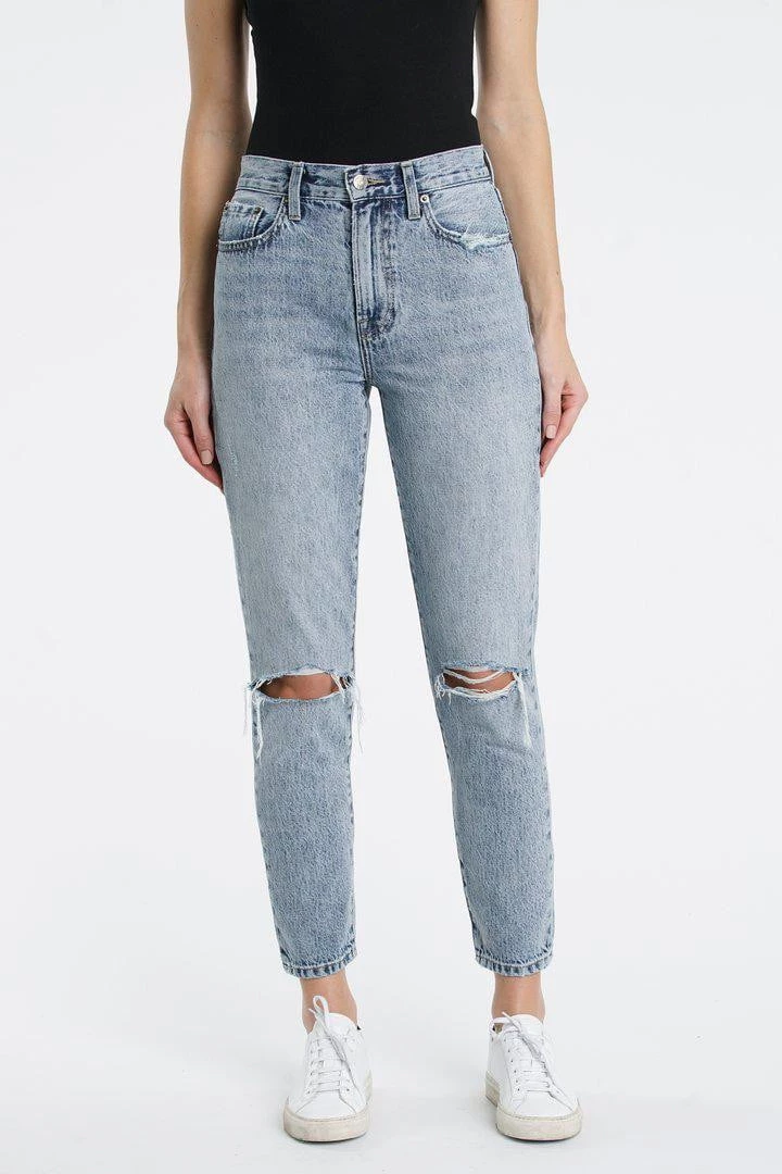 The Nico is a high rise mom jean. This style in the Wanderer wash features holes above both knees.