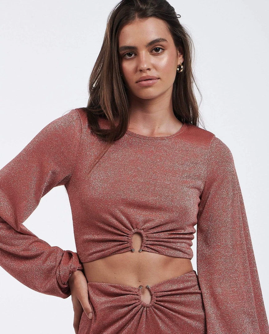 Exaggerated blouson sleeves and a cropped bodice make this shimmery lurex top a standout this season. Coordinate it with the matching Anouk skirt and platform heels for a dressy night-time ensemble.