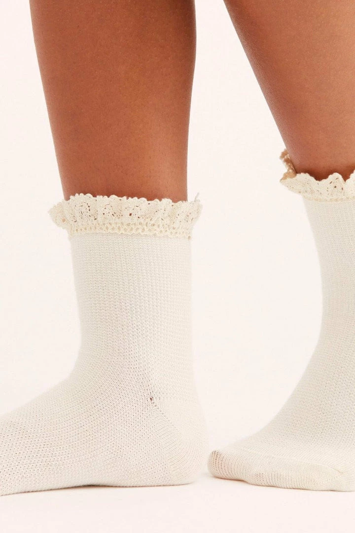 A classic with a twist, these so sweet waffle knit ankle socks feature a crochet lace ruffle at the top.