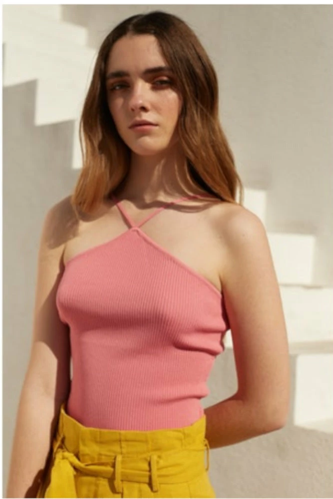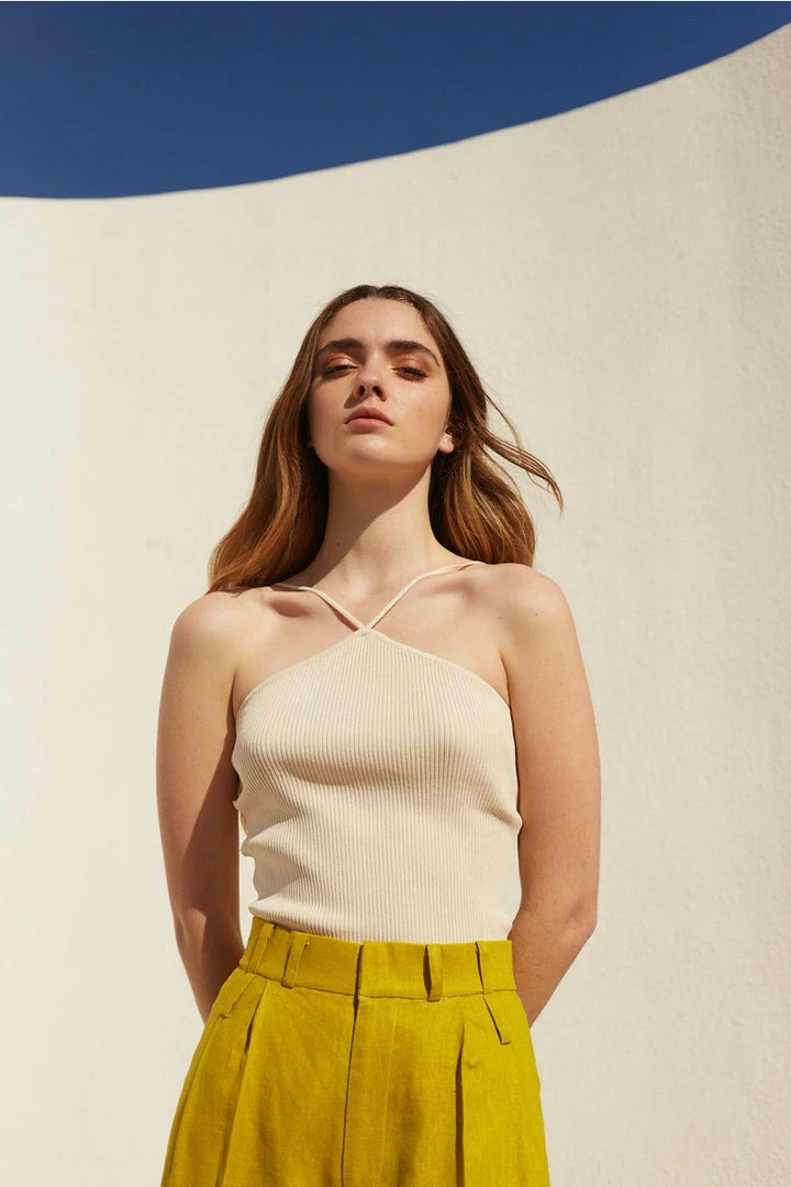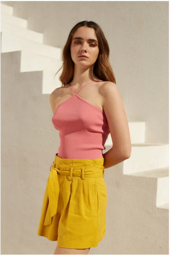 This Deluc April Top is a knit cropped top with cross cuff on neck.