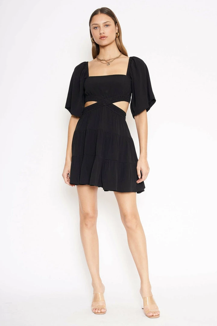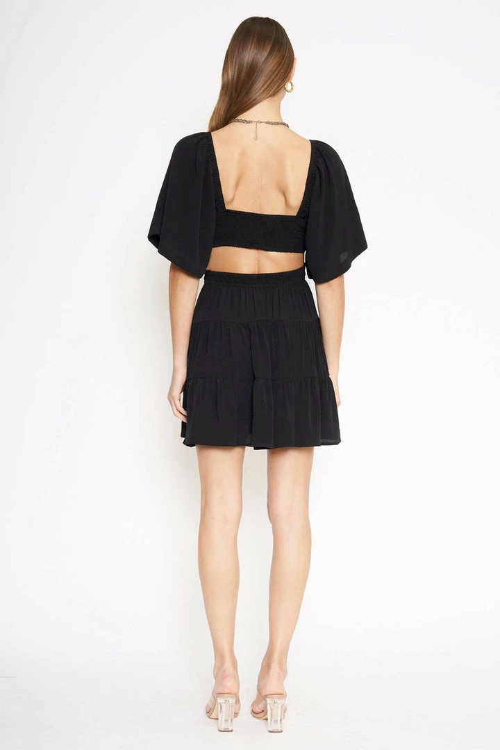 Black mini dress with side cutouts and a statement back, featuring bold sleeves for added dimension.