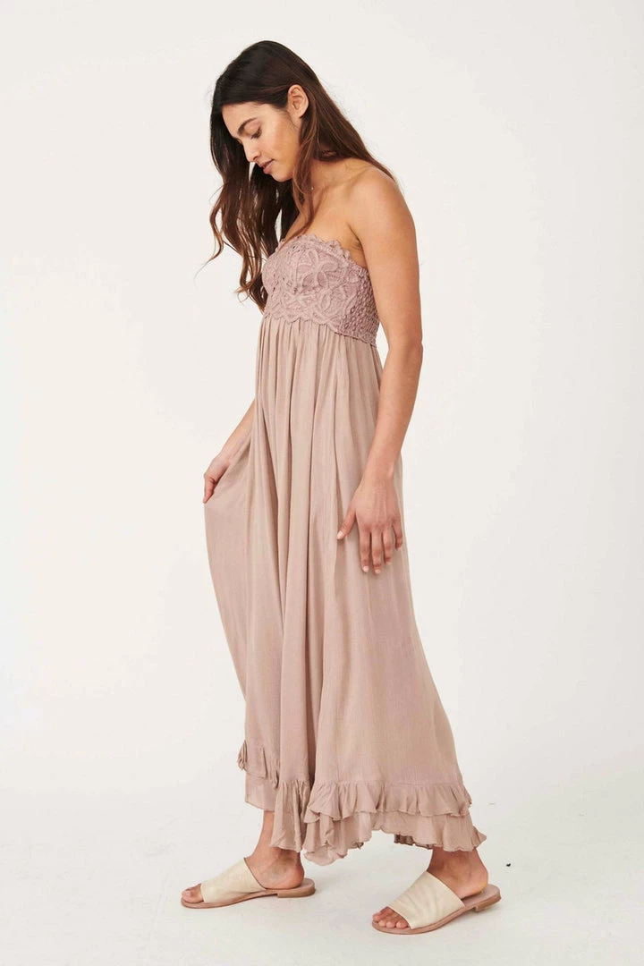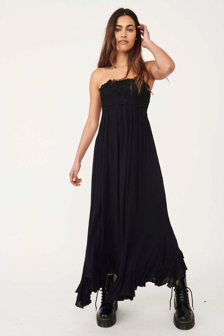 Perfect in a corset-inspired silhouette, this perfect maxi features lace piecing at the top and billowy, tiered skirt for added dimension.