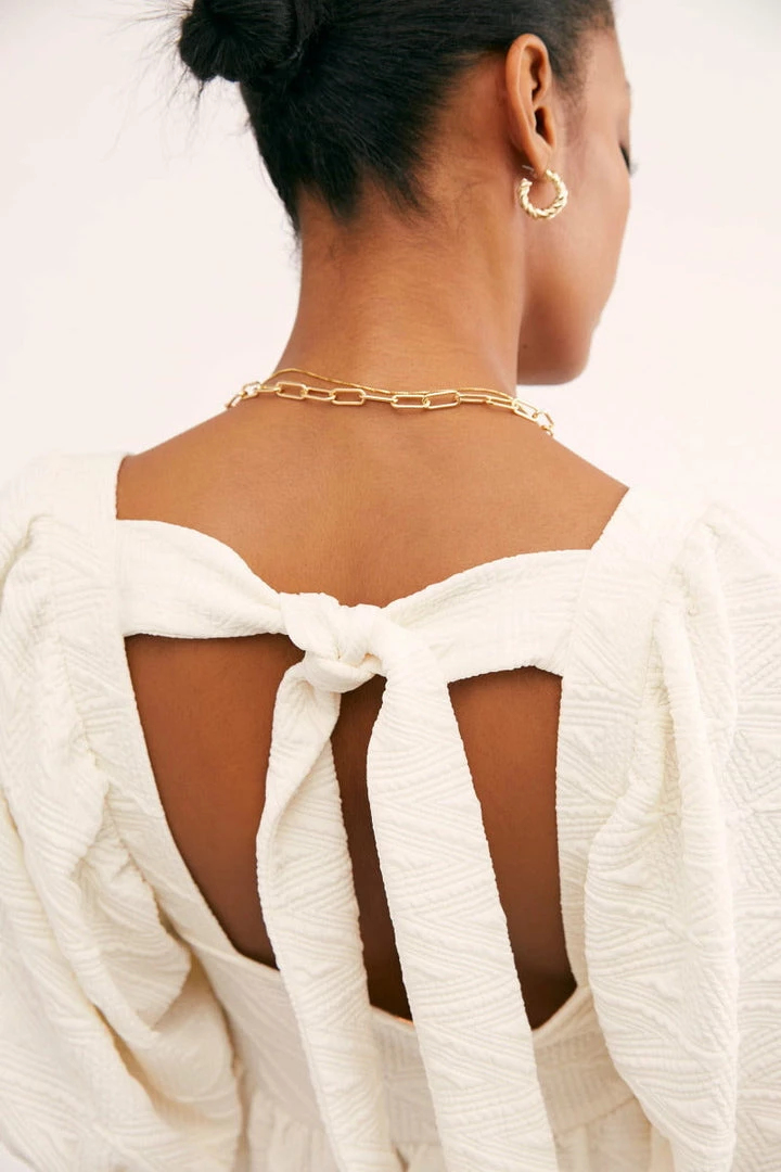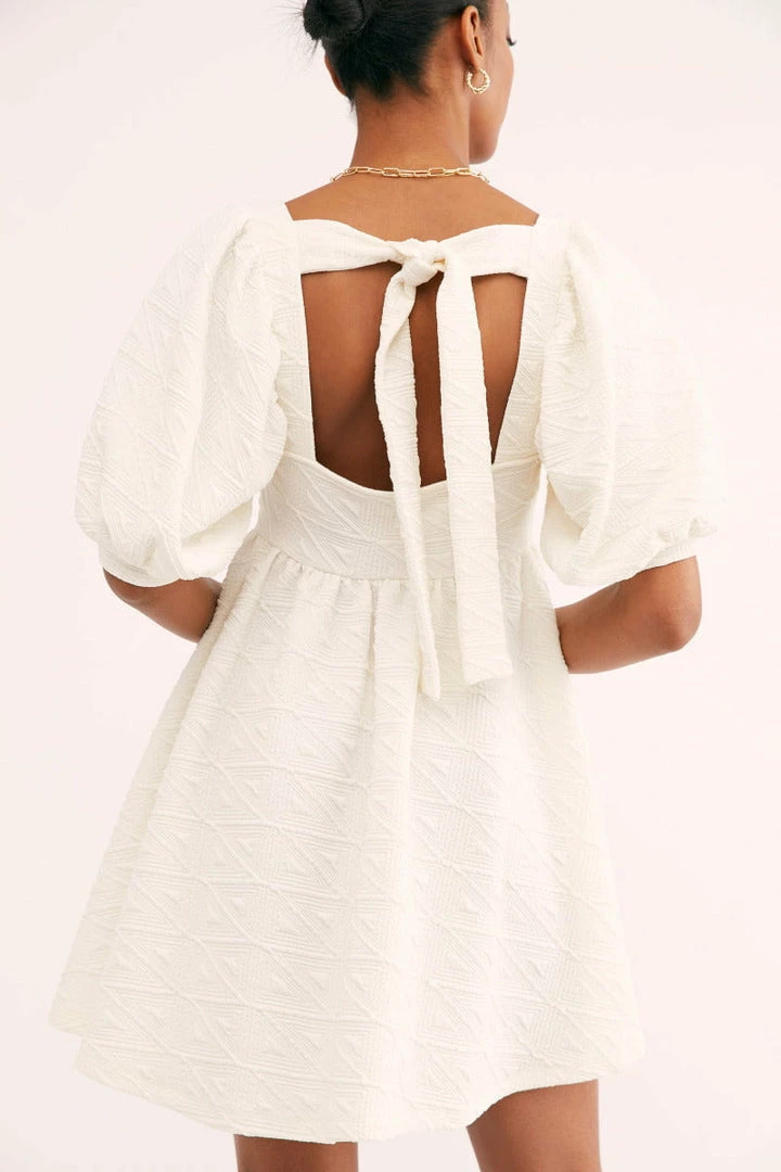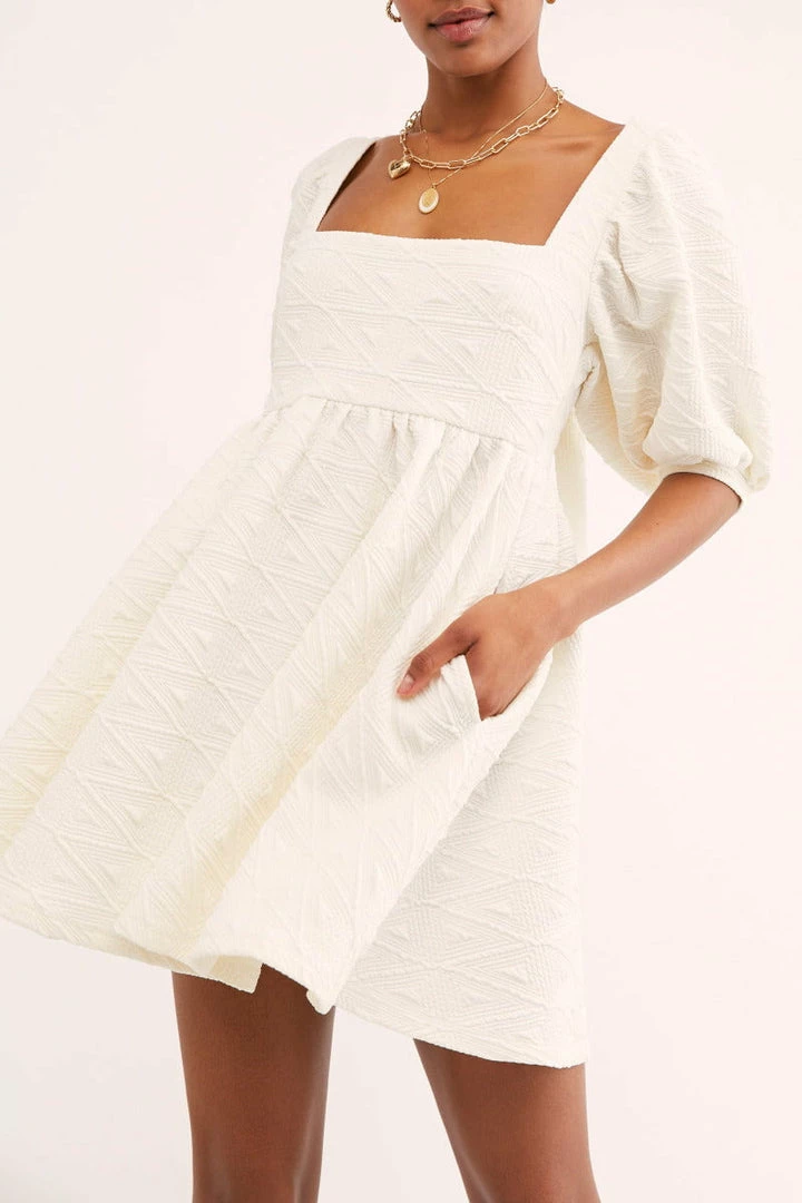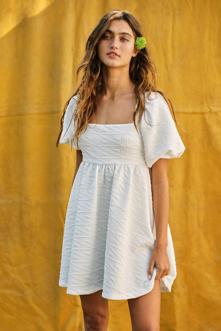 Pretty and puff sleeved mini dress featured in a textured fabrication and babydoll-inspired silhouette.