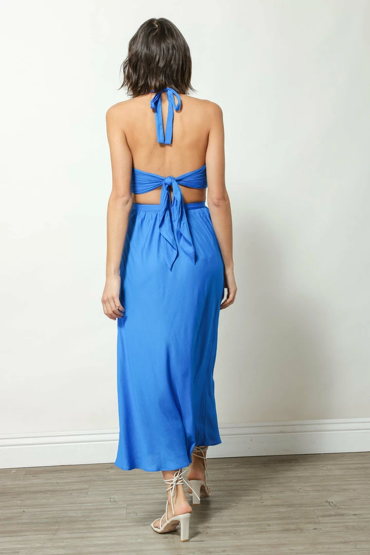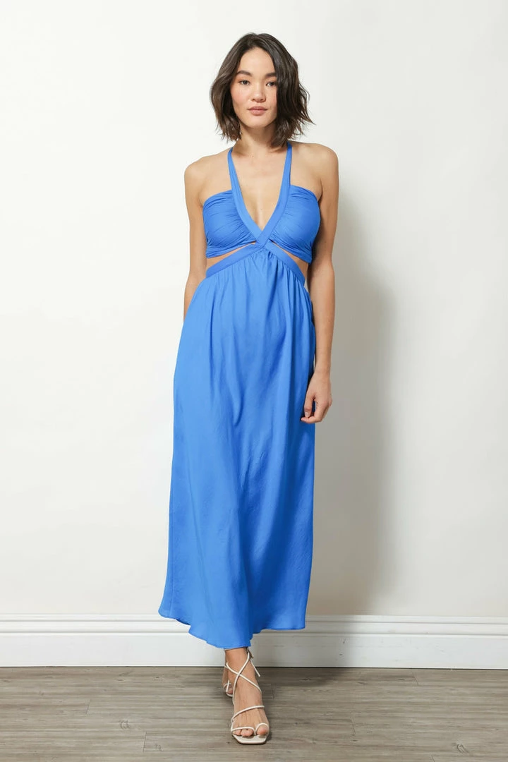 Side cutouts and halter neck ties add a fun detail to this satin dress that’s a stunner.