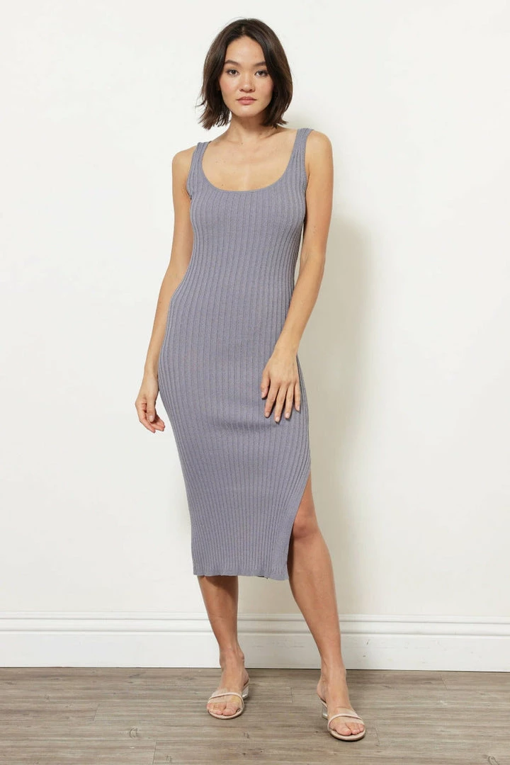 The Line + Dot Olsen Sweater dress is an unlined rib knit dress with a side seam slit. dress.