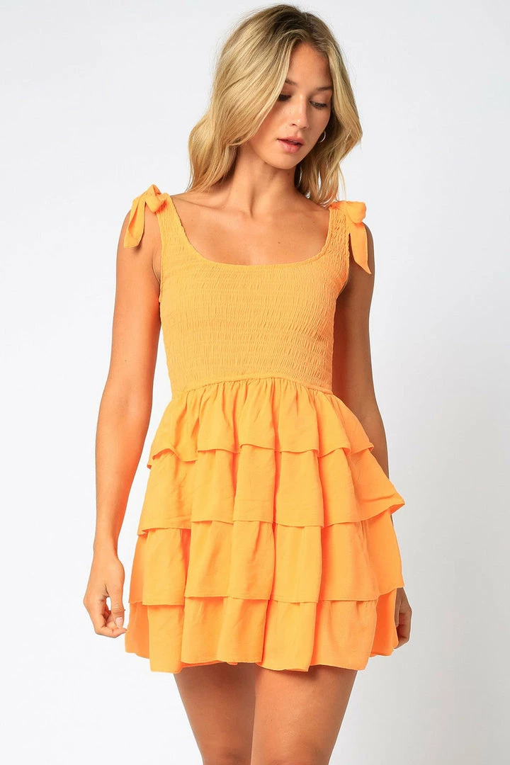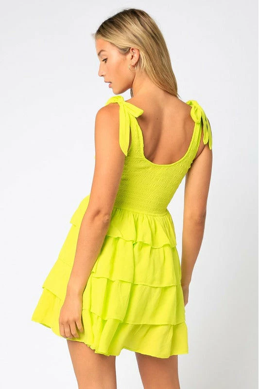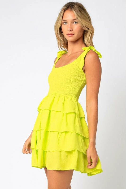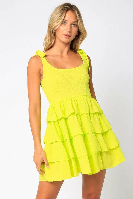 Our Solid Layered Mini Dress featuring a smocked bust and a shoulder ties.