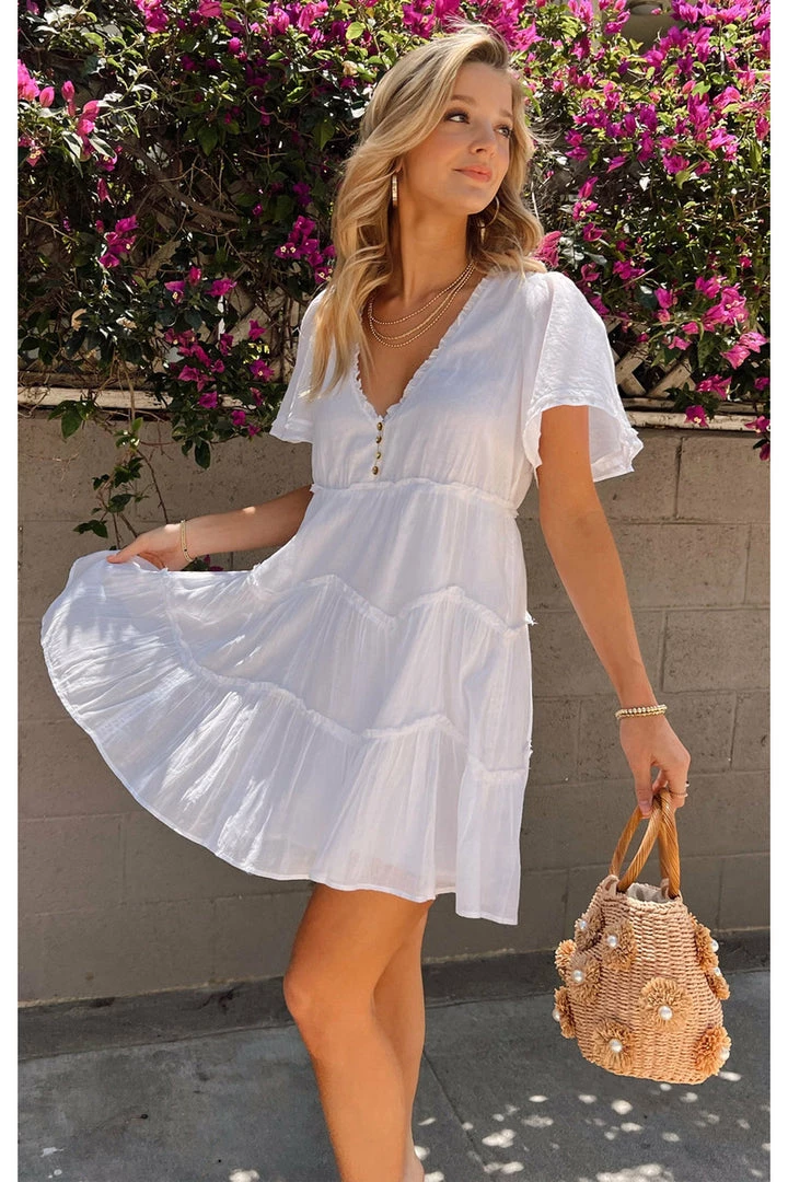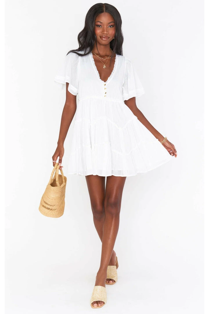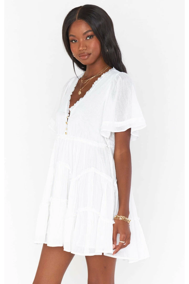 Country cutie in this white mini dress! A flirty poof sleeve meets a smocked bodice and square neck. A ruffled bottom hem completes the look! Throw on your boots or dress it up with a heel.
