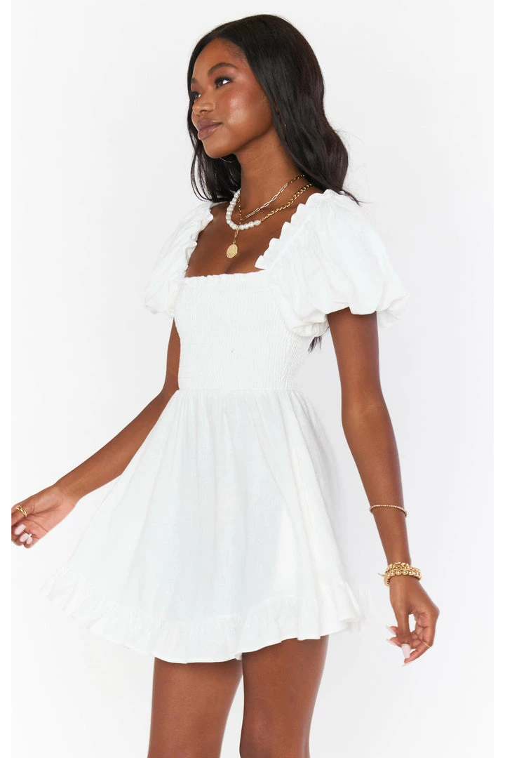Country cutie in this white mini dress! A flirty poof sleeve meets a smocked bodice and square neck. A ruffled bottom hem completes the look! Throw on your boots or dress it up with a heel.