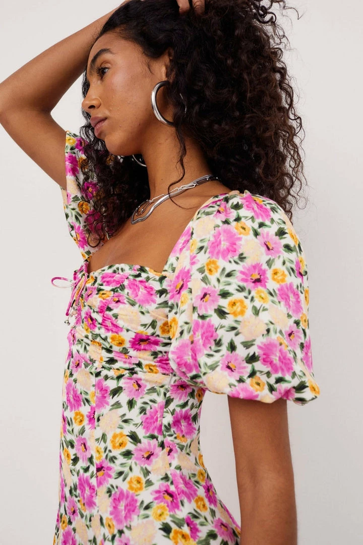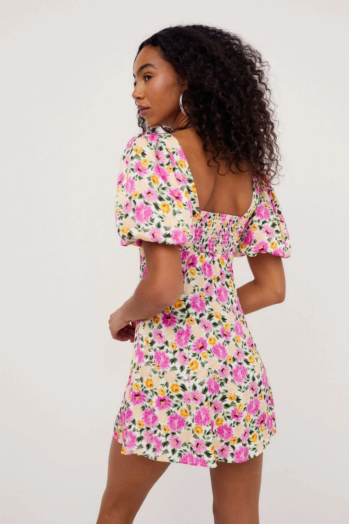 The Sasha is a vibrant floral mini dress featuring puff sleeves with elasticized opening, ruched detailing at bust and decorative front tie. Invisible zipper closure.