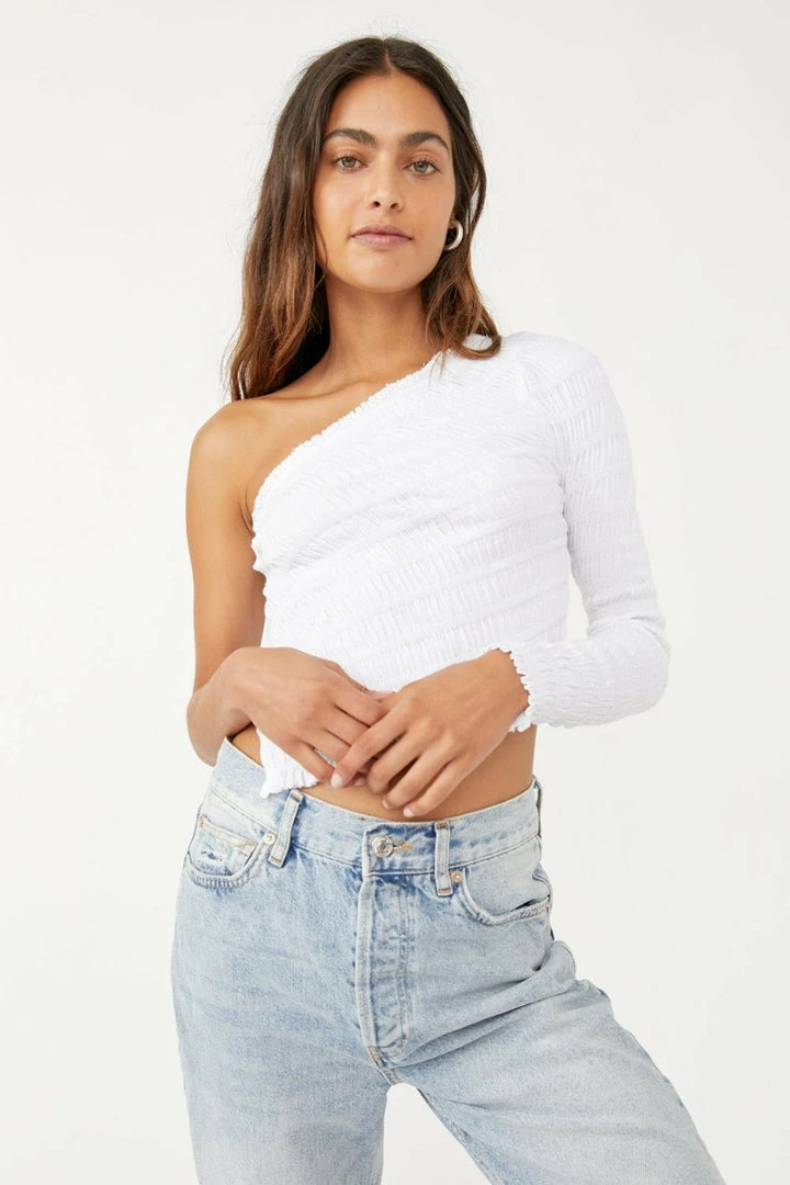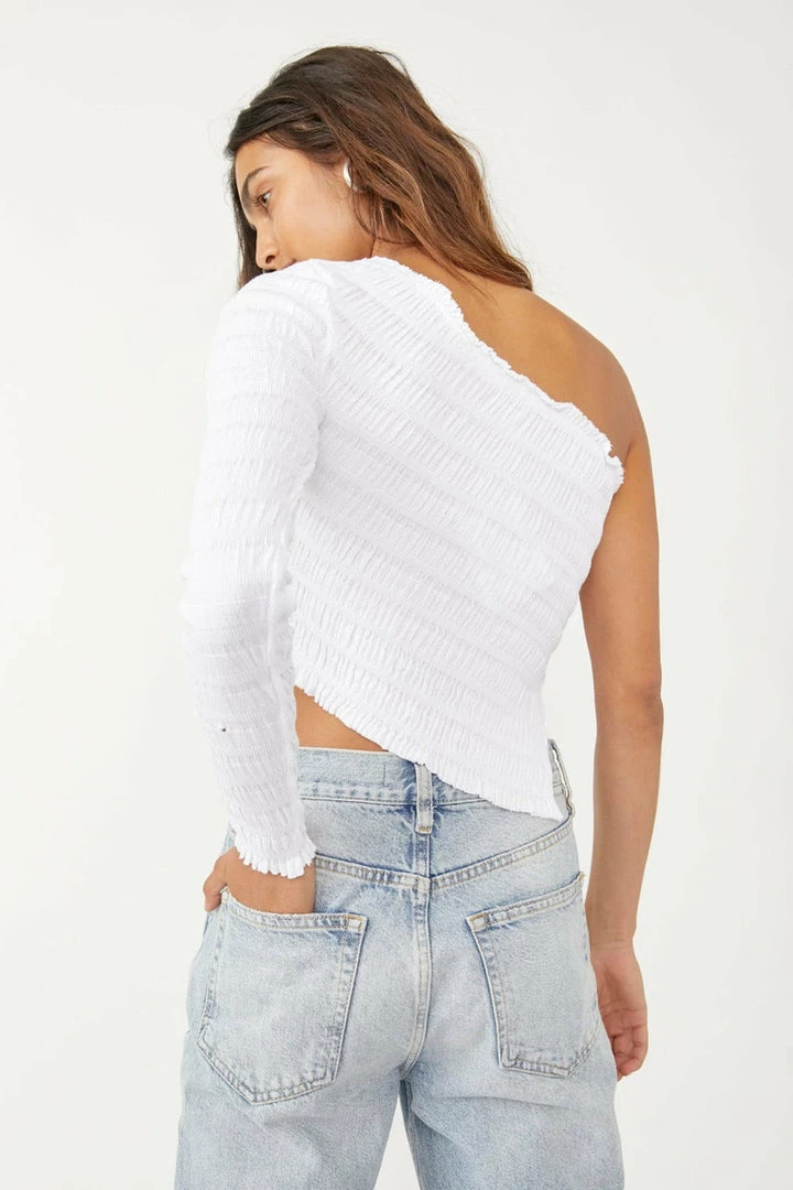 The perfect transeasonal staple, this top is featured in a one-shoulder silhouette with asymmetrical hem and smocked fabrication throughout for added texture.