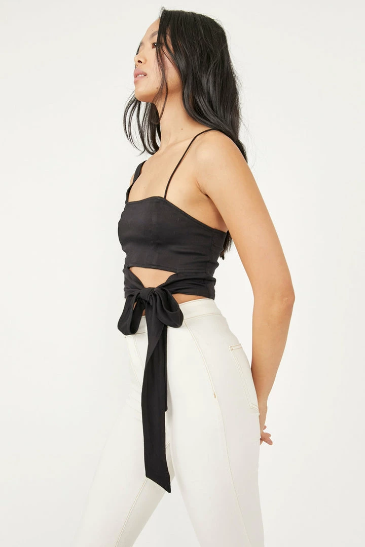 Turn heads in this forever timeless tank featured in a cropped silhouette with asymmetric strap detail and exaggerated bottom tie for added dimension.