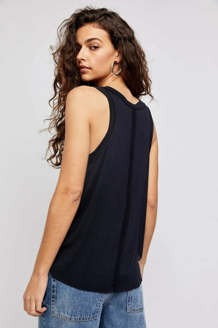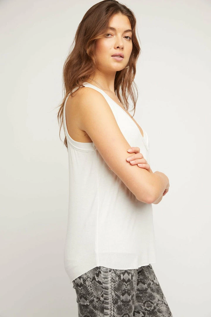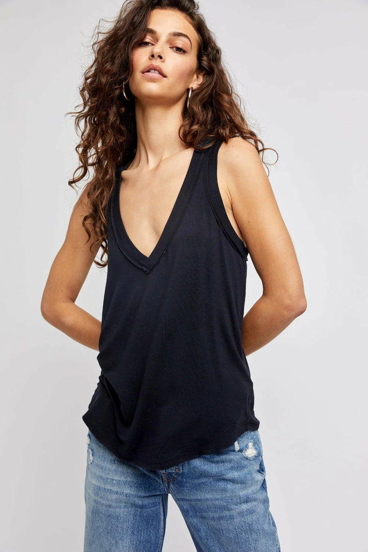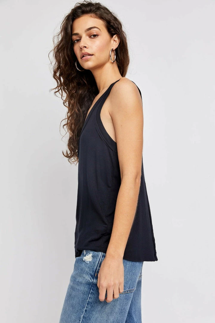 this timeless tank is featured in a flowy, V-neck silhouette with dropped armholes for added shape.
