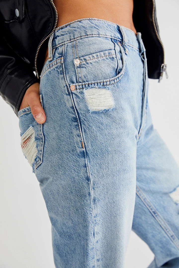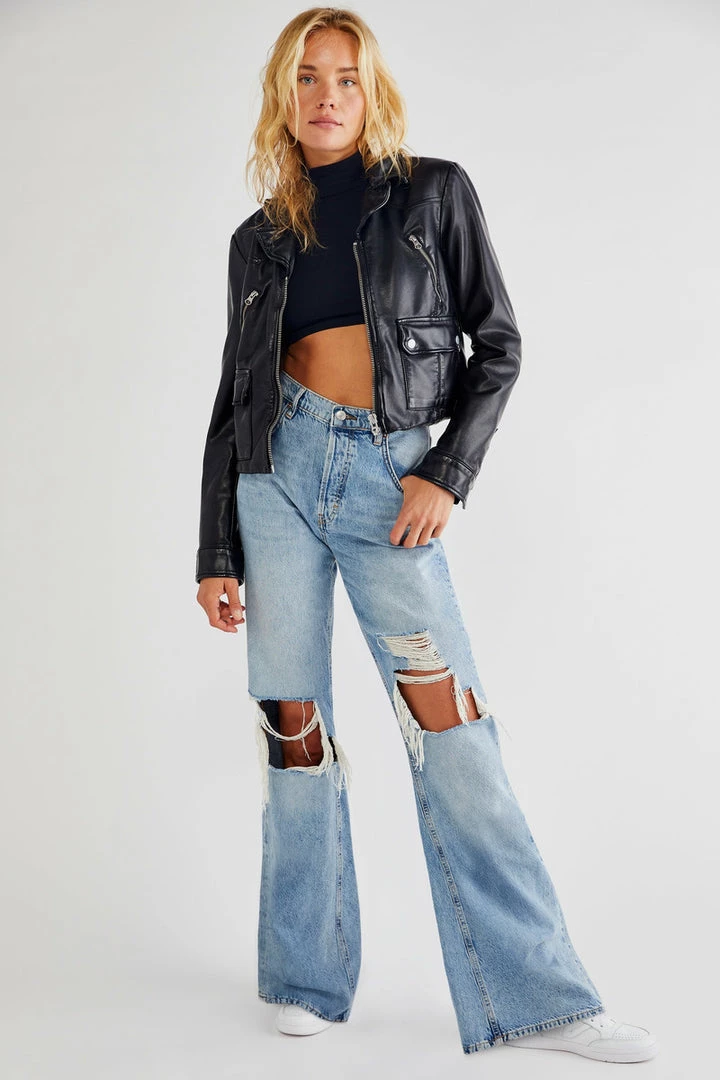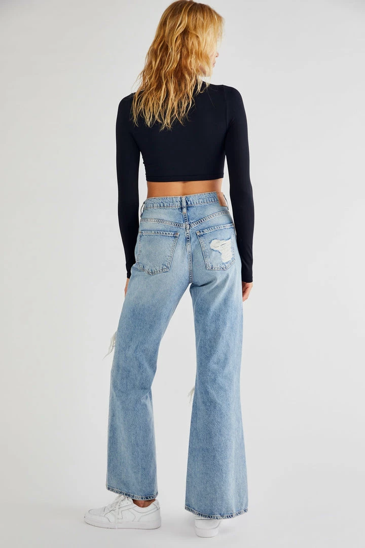 Perfectly distressed in a classic silhouette, these high-rise flares feature exaggerated rips throughout with frayed detailing and slouchy fit for the perfect broken-in look.