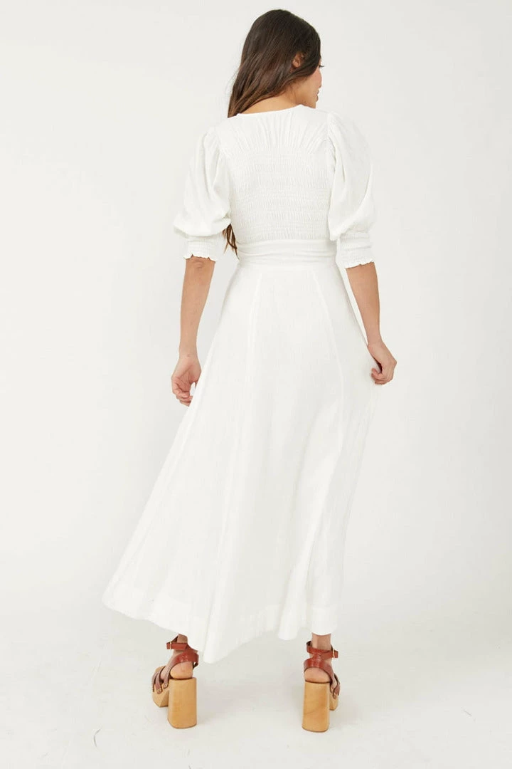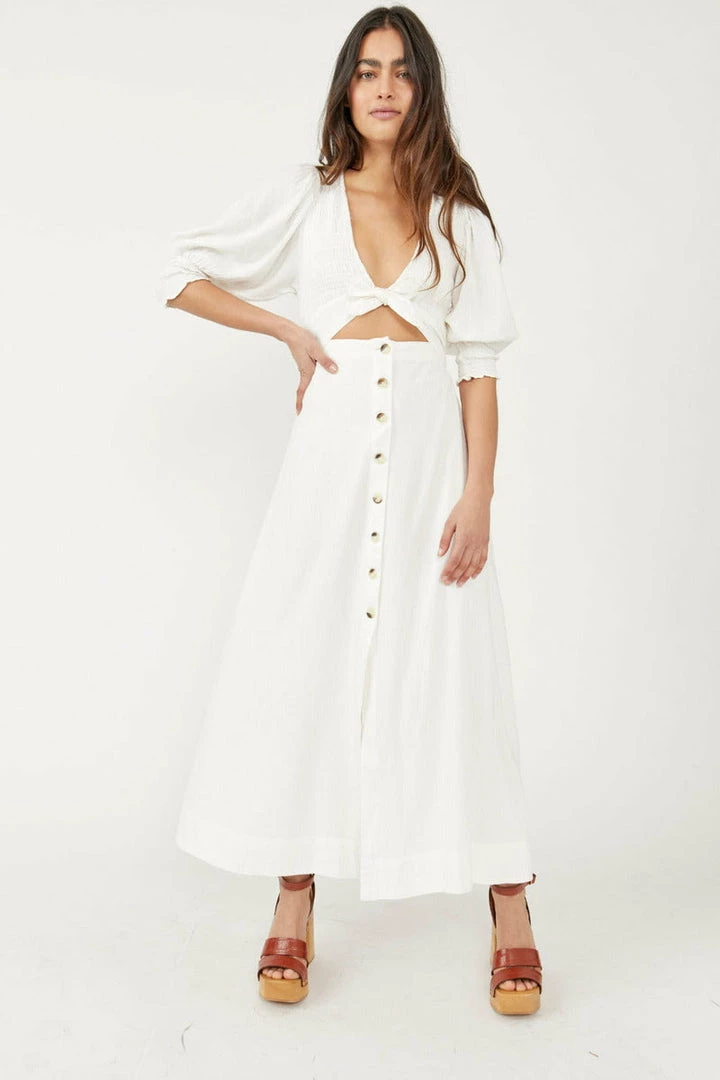 The definition of an effortless essential, this forever timeless maxi dress features a tie-front, puff sleeve top detail and button-front bottom piecing with cutout feature at center for added dimension.
