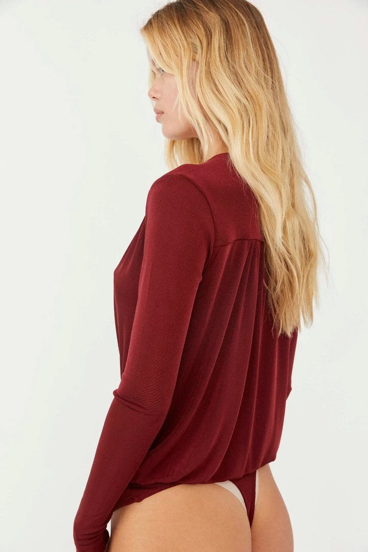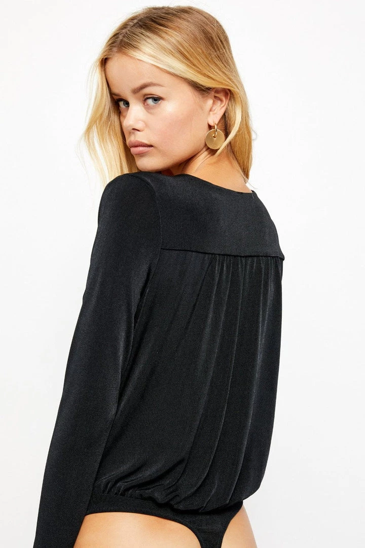 Designed in a slinky long sleeve silhouette, this cross-front body suit features a plunging V-neckline and pleating detail throughout.