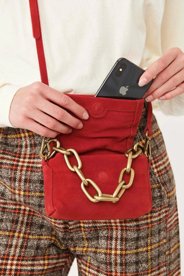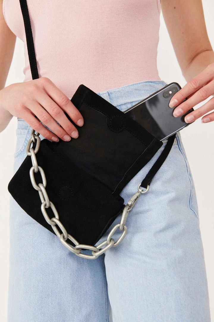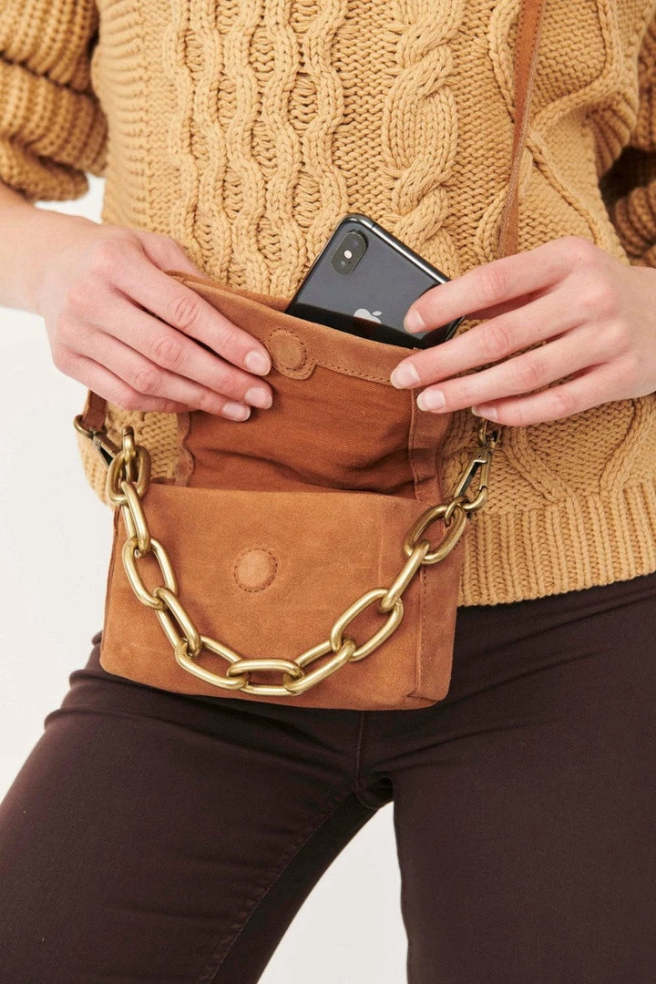 So cool crossbody with an edgy touch, featured in a soft suede fabrication with a spacious interior pocket and chunky chain-link detailing.