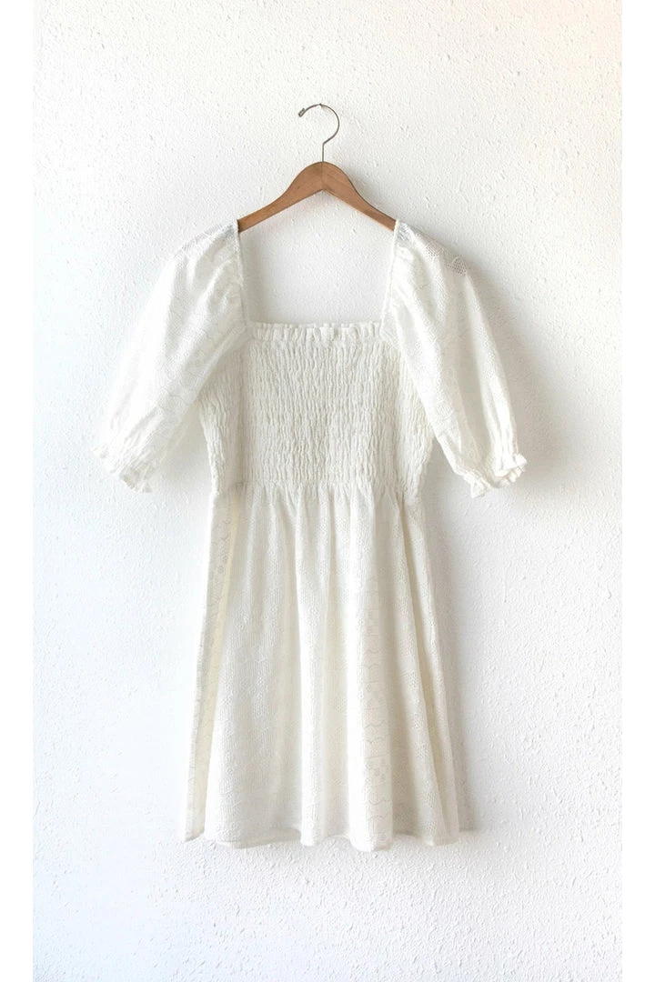 The Gia Dress from Greylin features a smocked bodice and puff sleeve in a Embroidered Eyelet fabric.