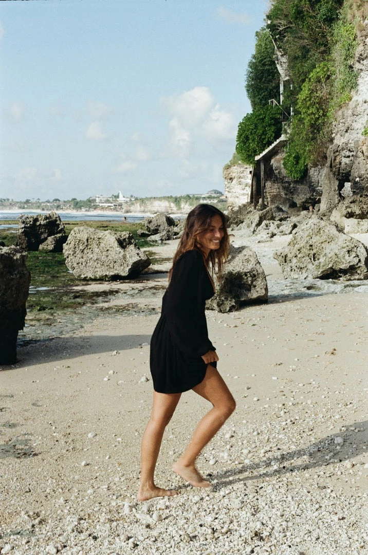Solana solid plunging neckline, long sleeve mini dress in Black. Model is wearing size Small. Made with Eco-Vero Viscose Crepe—this fabric has beautiful drape & an incredibly soft touch. It has a slightly textured crepe surface that adds a feeling of cosiness and ease.