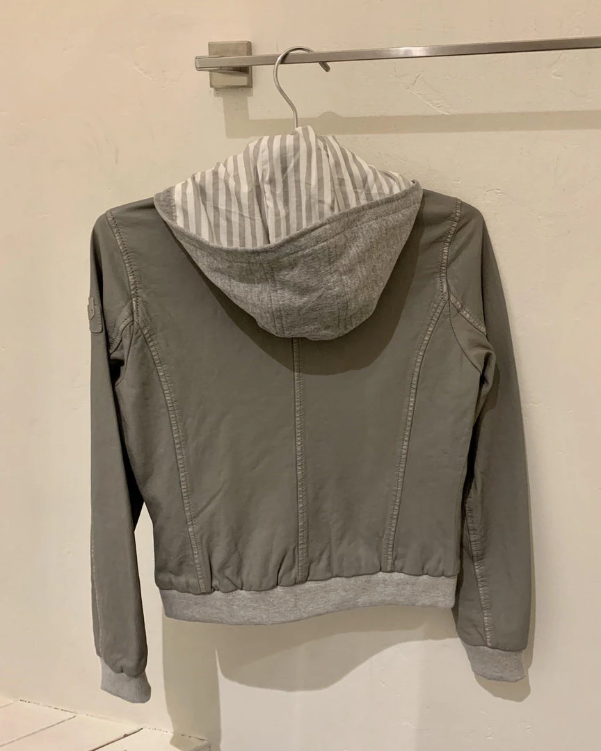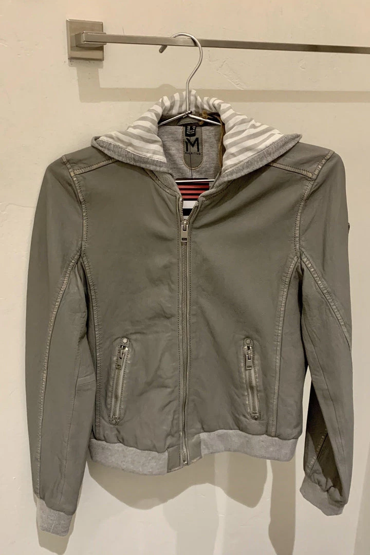 A soft leather jacket by Mauritius. A timeless jacket with a twist, this jacket features a hood with white and grey stripe fabric on the inside.