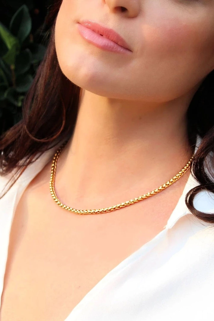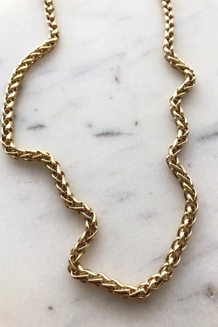 On trend textured woven chain in 14k gold filled. Looks great layered or as a stand alone! 16″ length. 14k gold filled materials.