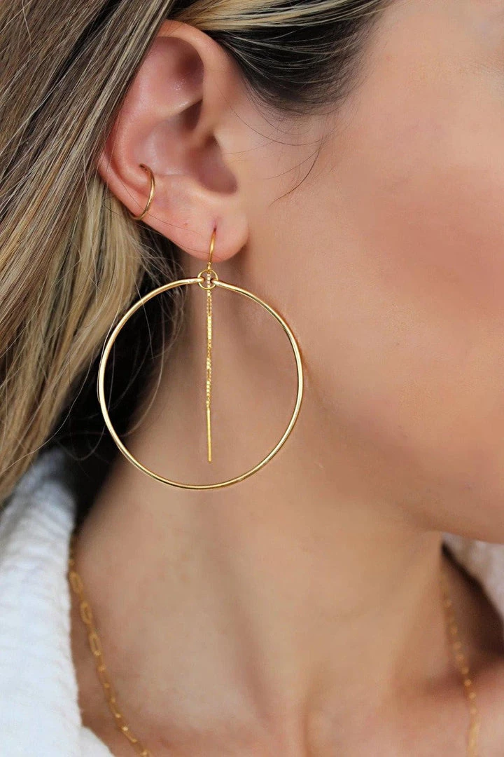 A modern take on a classic- a shiny 14k gold filled hoop with threader drop. Total hoop diameter 2″.