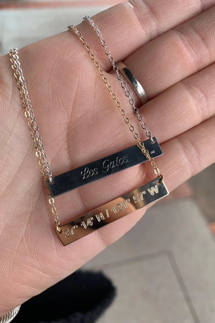 Our best selling necklace! Gold fill or sterling silver bar necklace with the name of a city on one side and the coordinates to that city on the other. Makes a great grad gift for those going out of town or out of state for college!