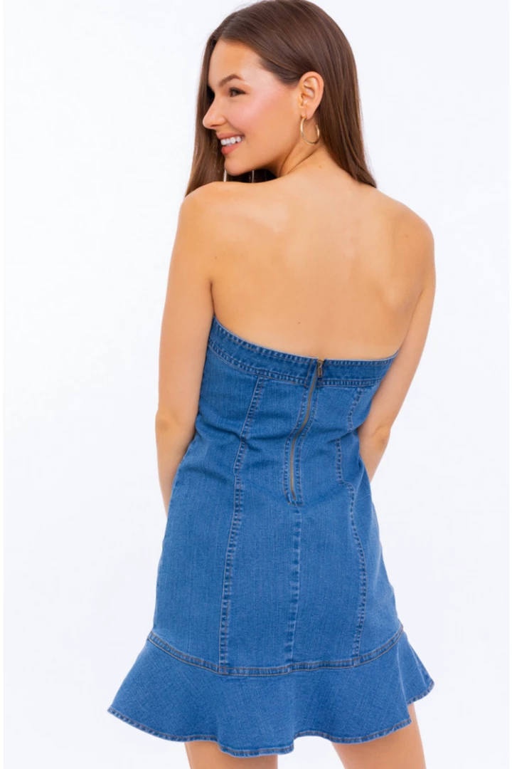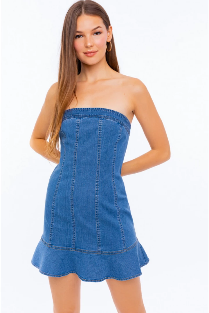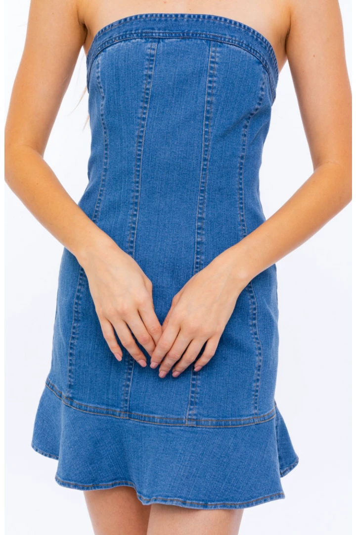 Stretch denim tube dress with ruffle bottom detail.