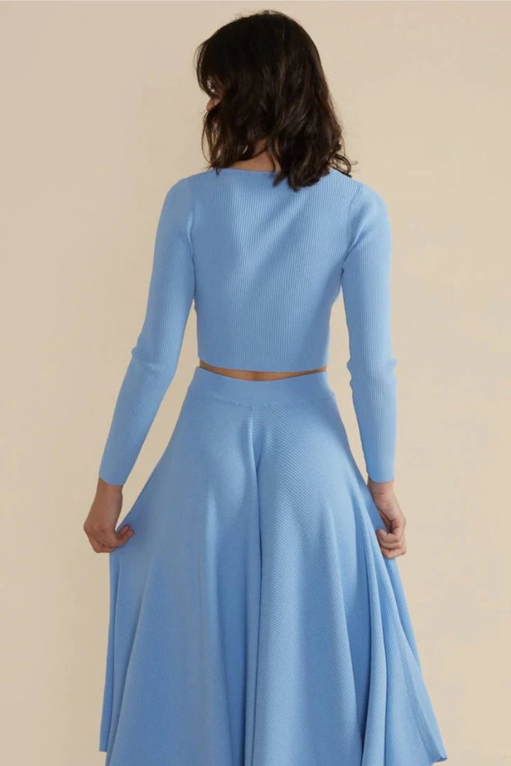 Our Laur Knit Top is a stunning twist front crop, with a V neckline and long sleeves in a ribbed fabrication.