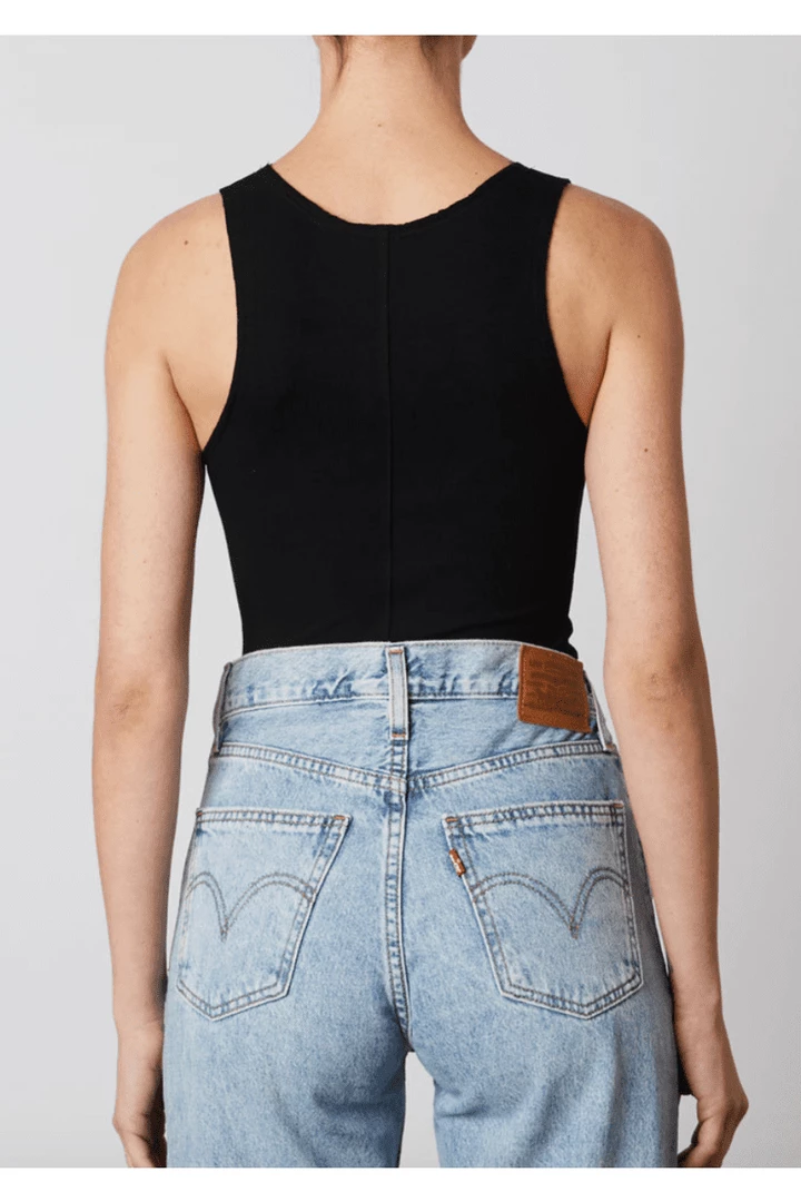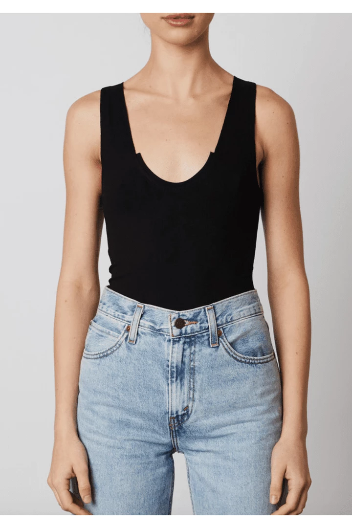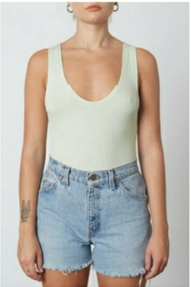 Racer back tank with a scoop neckline.