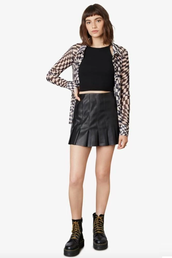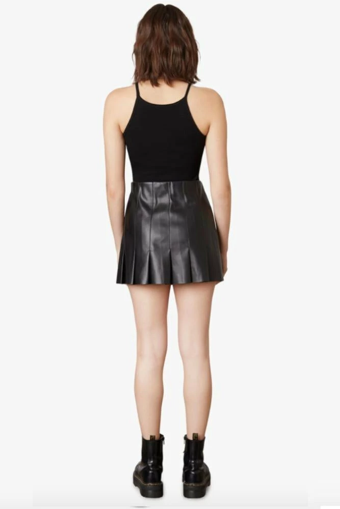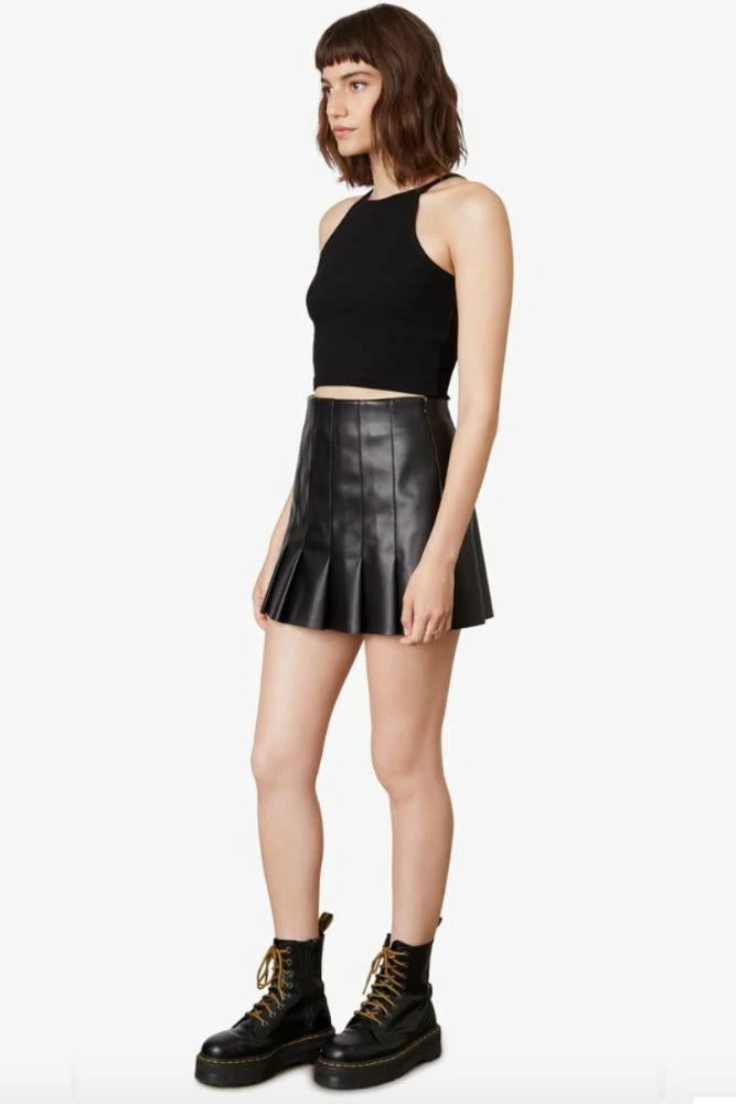 High-waisted pleated vegan leather skirt with side zipper closure.