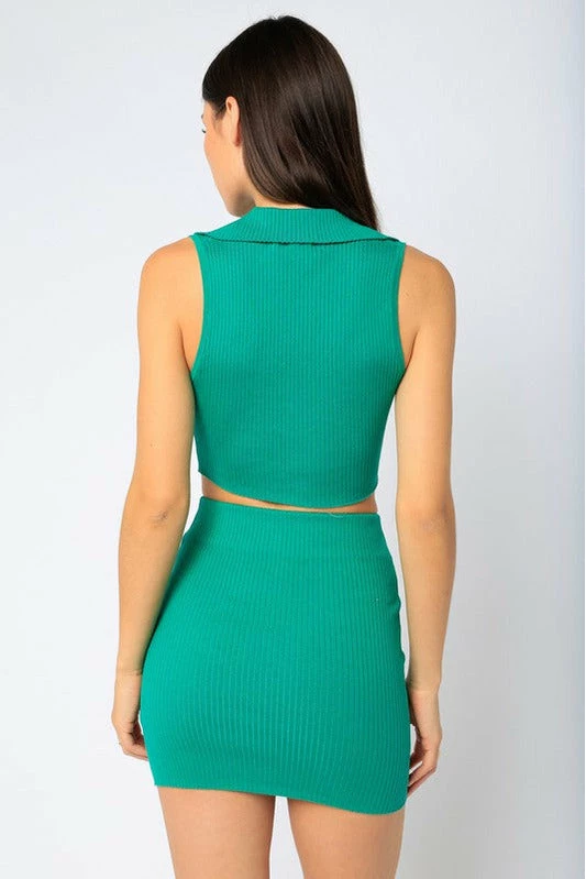 The Olivaceous Collar Cropped Top features a polo collar and a ribbed.