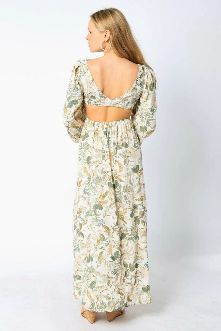 This Olivaceous Tropical Smocking Cut Out Maxi Dress featuring a smocked bust and blouson sleeves.