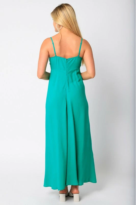 The Olivaceous Stevie Maxi Dress features a sweet heart neckline with tie front and an adjustable spaghetti straps.