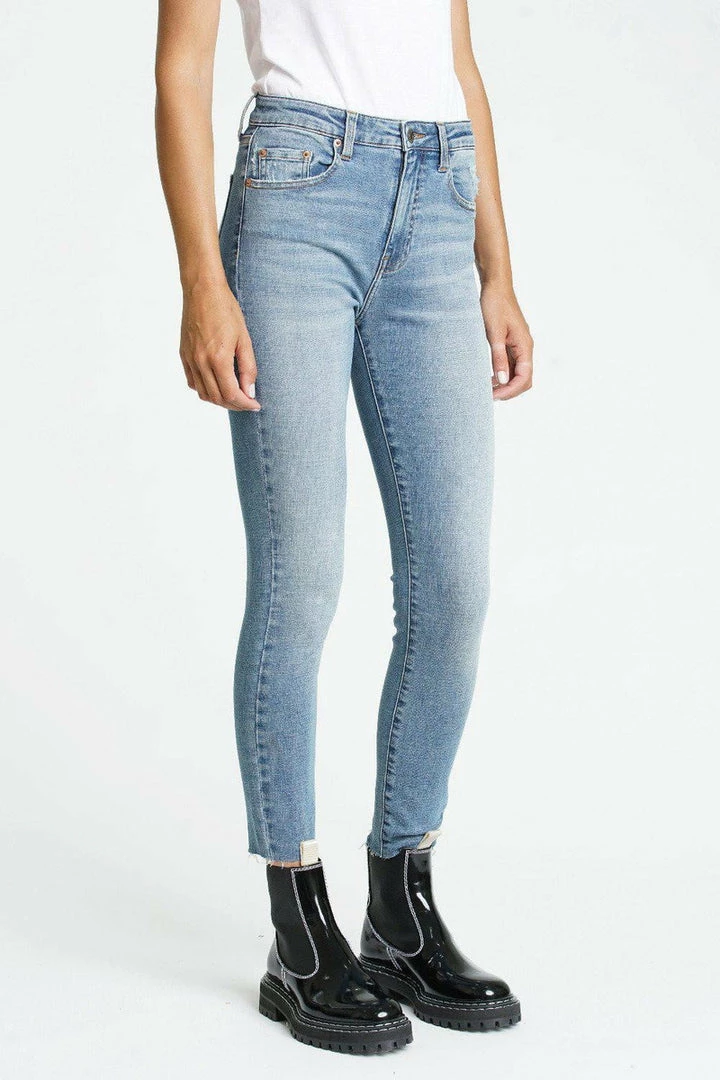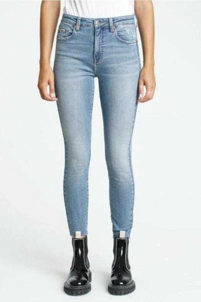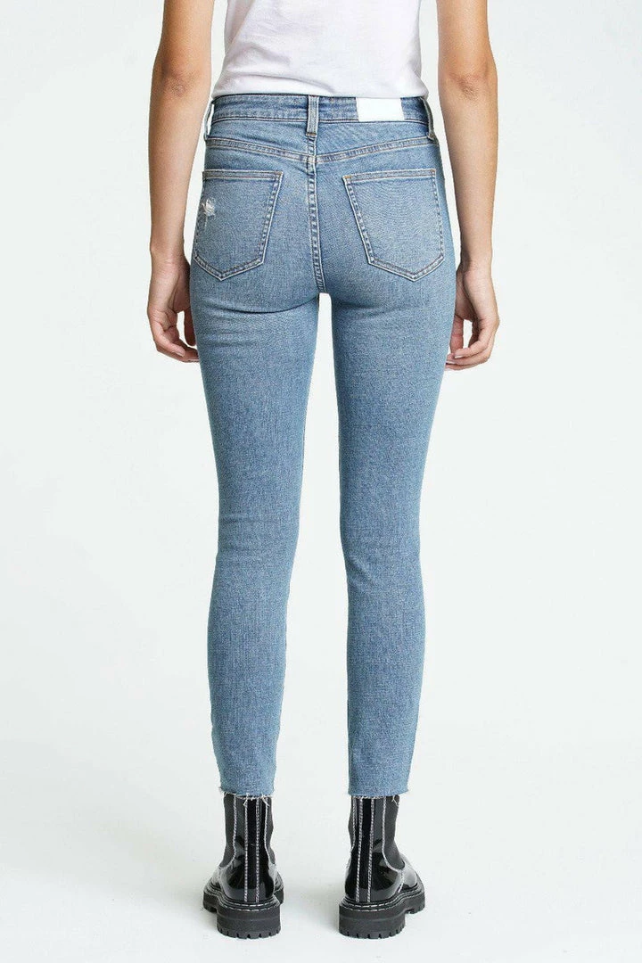 The Aline is a high rise skinny jean. The Aline in Marmont is a denim wash with distressing on the thigh.