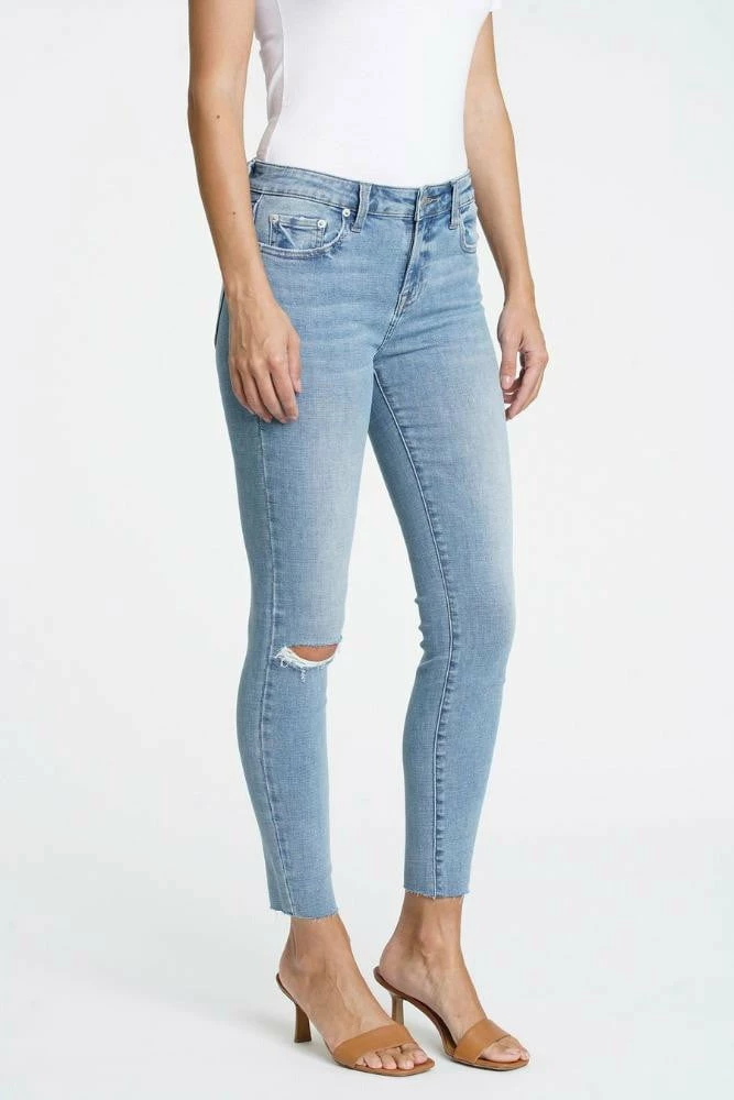 This second-skin style comes in a classic light wash and features a subtle knee rip.